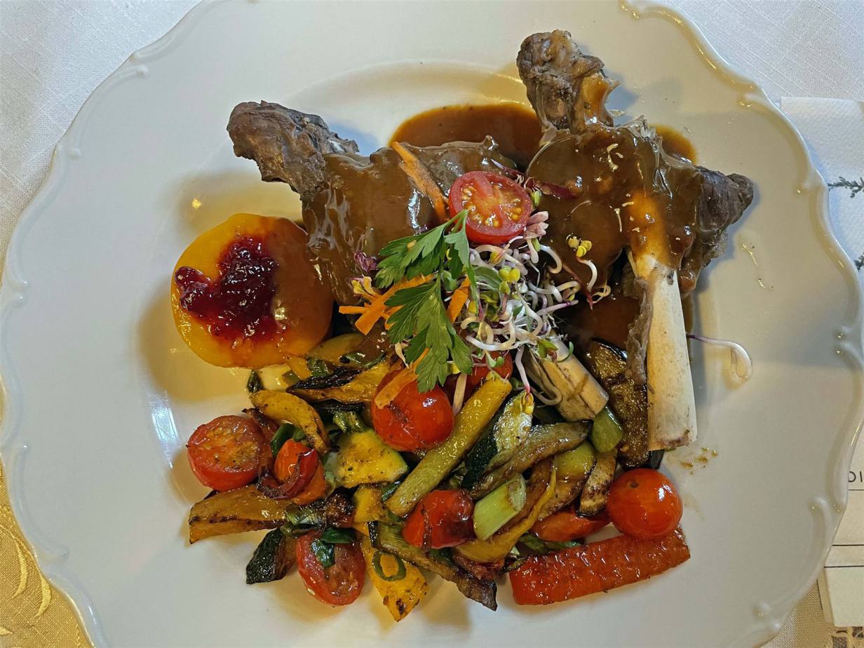 Nach dem Besuch der schönen Anlage ging es nochmals 8 km weiter zum Naturschutz Zentrum. Vom Parkplatz aus muss man zu Fuss noch etwa 500 m hochlaufen. Das Zentrum hat eine interessante Ausstellung zum Wald. Eigentlich wollten wir etwas Wandern von dort aus. Die Wege gehen aber nur in eine Richtung nämlich aufwärts. Also entschlossen zurück ins kleine Dorf zu laufen und dort ein Restaurant zum Mittagessen zu suchen. Dort kam dann die Meldung von Morelo, dass wir das Fahrzeug am Samstagmorgen um 11.00 Uhr abholen können. Also nochmals eine Verlängerung des Mietautos und ein neues Hotel. Wir blieben in Ebrach in einem alten Hotel mit dem Namen Gasthof zum alten Bahnhof. Ein Bahnwagen dient als Restaurant und steht noch auf den Schienen in das Hotel integriert. Vor dem Essen haben wir noch etwas Kleines gegessen. In dieser Zeit hatte es kräftig etwa eine halbe Stunde geregnet.