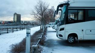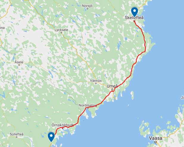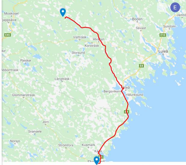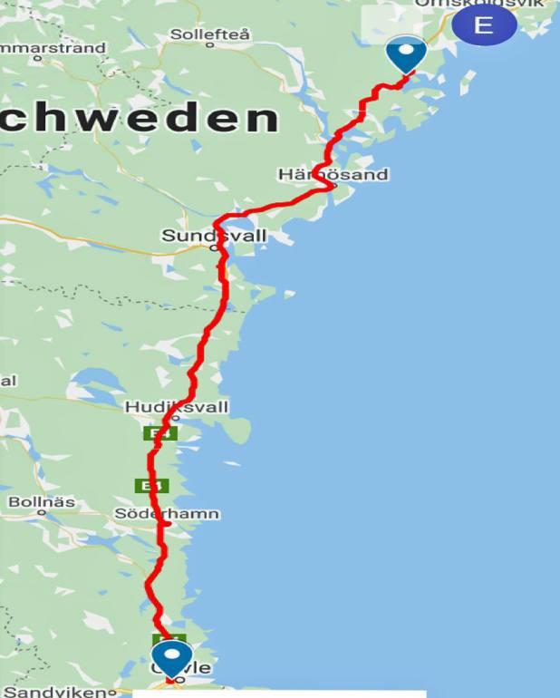 Als ich um halb neun erwachte schien bereits die Sonne. Die Temperatur lag bei - 10 °C. Heute folgte ich der E06 weiter gegen Norden. Das soll die letzte Etappe auf der Eo6 sein. Morgen geht es Richtung Westen ins Landesinnere. Aber zuerst zu heute. Nach dem Frühstück war es dann bereits halb Zehn. Aber ich hatte es ja nicht eilig. Auf dem Weg zu meinem Zwischen Stopp in Örnsköldvik rund 40 km durchfuhr ich verschiedene Klimazonen. Mein Thermometer zeigte kurz nach der Abfahrt - 17° C dann -12°C weiter - 20° C und am Ende waren es den ganzen Tag - 10° C. Es war Zeit zu tanken. Ich hatte die Wahl. Es gab vier Tankstellen innerhalb 200 m. Die günstigste war 21.0 SKr. der Liter nicht der Tank, Das sind rund 2.10 Sfr. Eine Tankfüllung macht dann rund 320 Sfr. Wir können in der Schweiz noch froh sein mit 1.83 Sfr. Aber was solls man gönnt sich ja sonst nichts. Jedenfalls machte ich noch einen kleinen Abstecher in die Stadt. Wir waren schon zwei mal da aber nie im Winter. Am Hafen gibt es einen schönen komfortablen Stellplatz mit allem was man sich so wünscht. Ich habe noch eine Drohnenaufnahme gemacht. Das ist die Stadt wo man von der Skisprungschanze direkt unter der Bahn durch in die Stadt ausläuft.