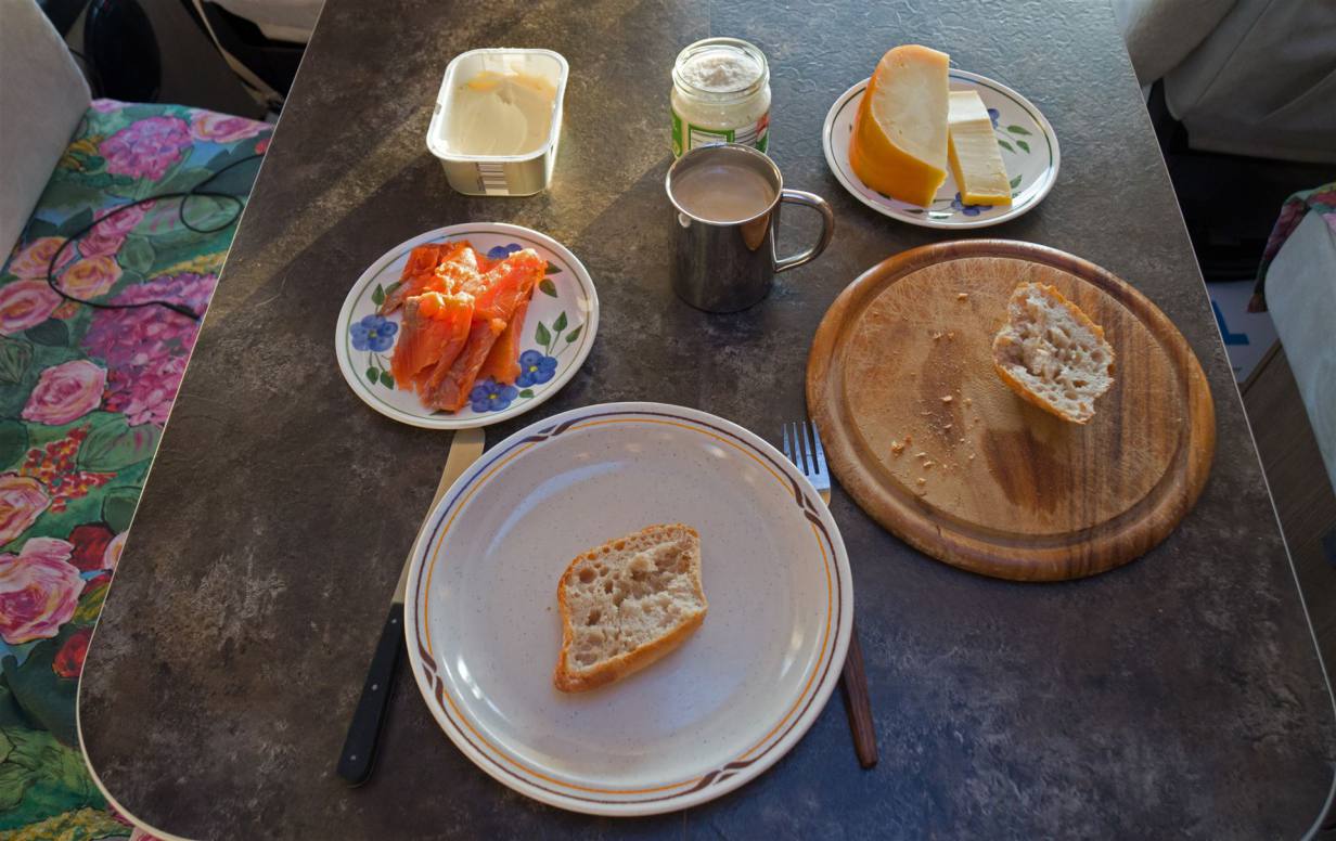 Als ich heute Morgen den Vorhang hoch stiess war ich doch erstaunt. Blauer Himmel wolkenlos. Das war der erste Sonnenschein den ich seit meiner Abfahrt am Montag gesehen habe. Das muss gefeiert werden mit einmal ein Brunch zu machen. Also Lachs aus dem Tiefkühler nehmen, den Backofen anwerfen und den Käse aus packen.