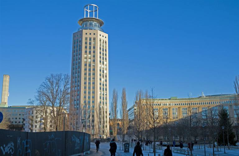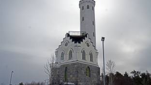 Eine weitere Überraschung heute Morgen. Als ich den Frontrolladen öffnete strahlte mir eine weisse Landschaft entgegen. Es muss in der Nacht kälter geworden sein und so ist der Regen in Schnee über gegangen. Durch den starken Wind war die Temperatur noch tiefer und es war alles gefroren. Unter dem Schnee Eis. Ich hatte so meine Befürchtungen wie das wohl auf dem Weg aussieht. Die E6 ist zwar eine Autobahn, aber je höher man kommt sind es entweder eine oder zwei Spuren Kilometerweise alternierend. So stellte die Fahrt einige Forderungen an den Fahrer. Meistens waren die ersten 75 km Schnee und auch Eis bedeckt. Zum Teil hatte es Stellen ohne Schnee und Eis. Dazu wurde man hie und da von einer Faust von der Seite erwischt. Ich erschrak dabei und schon war es wieder vorbei. Der Wind ist immer noch ein Thema und zwar stellenweise, weil die Strasse oft von Wäldern begleitet ist, die den Wind abhalten. Nach 100 km wollte ich einen kleinen Halt in Söderhamn. Ich zog mich warm an und marschierte los. Zuerst sah ich einen Turm hoch oben. Da musste ich natürlich hin. Das ging als Morgen Walking. 160 Stufen führten hinauf. Von oben hat man eine schöne Aussicht auf die Stadt.