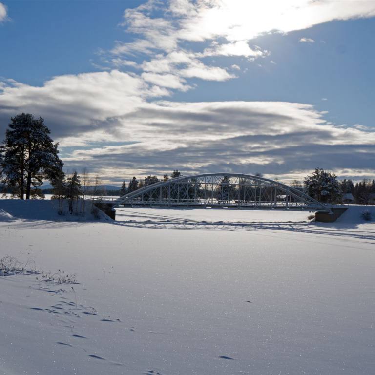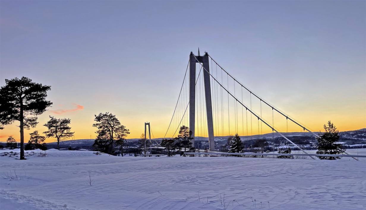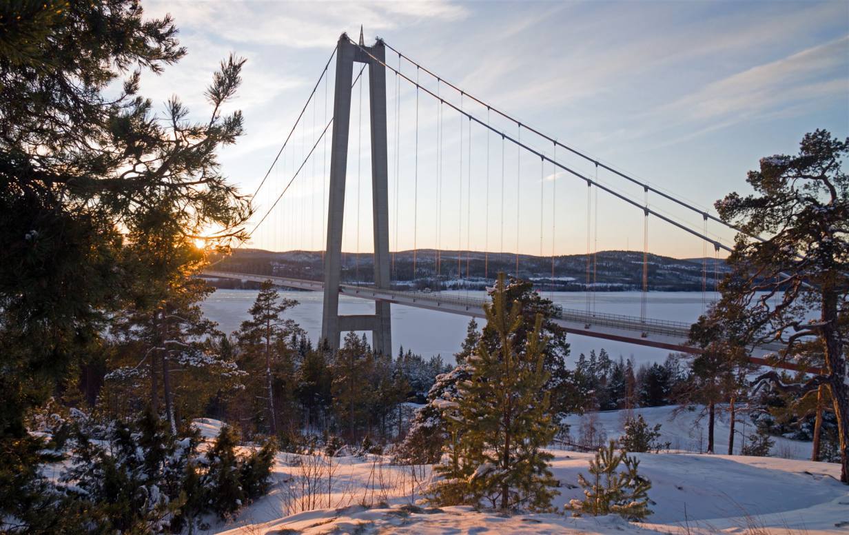 Gegen Mittag zog ich weiter. Die Strassen wurde etwas besser und so war das Fahren nur noch stellenweise eine Herausforderung. Später hatte es wenigstens kein Eis mehr und eine Spur war praktisch frei. So erreichte ich kurz nach 15.00 Uhr die Höga Kusten brücke. Die Sonne ging gerade hinter einem Hügel hinter der Brücke unter. Ein traumhafter Ausblick. Schnee, rote Sonne und die elegante Brücke im Vordergrund. Die Hängebrücke gehört zur E4 und überspannt den Fluss Ångermanälven. Durch ihre Konstruktion und die große Spannweite (1.210 m zwischen den Stützen) erinnert sie an die Golden Gate Bridge in San Francisco. Anschliessend fuhr die letzten 60 km zum Naturum. Es dämmerte bereits. Die Stimmung mit der Sonne die rot sich hinter den Hügeln versteckt hatte und dem blendend weissem Schnee war unbeschreiblich. Es ist inzwischen - 6 Grad Celsius.