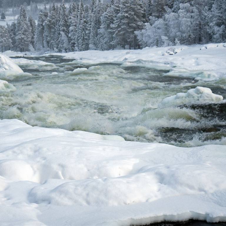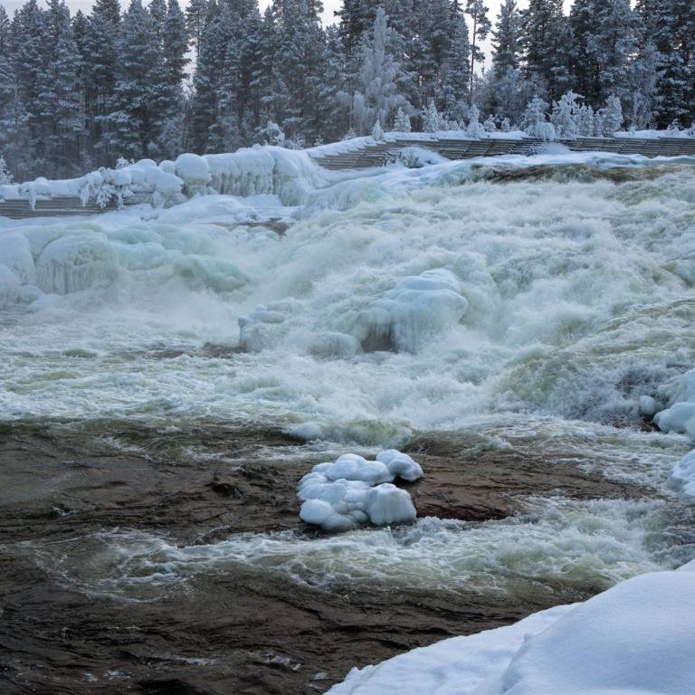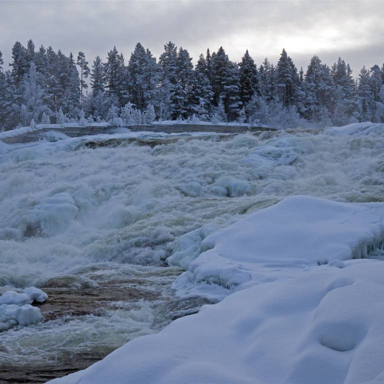 Storforsen ist der Name großer Stromschnellen am Piteälven in der in Nordschweden. Sie liegen etwa 38 km nordwestlich des Ortes Älvsbyn. Bei einer Fallhöhe von 60 Metern wälzen sich durchschnittlich 250 m³ Wasser pro Sekunde talwärts, was sie zu den größten Stromschnellen Skandinaviens macht. Die Gesamtlänge der Stromschnellen von Anfang bis Ende beträgt 5 km, wobei sie dabei eine Höhendifferenz von 82 m überwinden. Während der Mittsommerwochen ist das Wasserniveau am höchsten, wobei dann ca. 870 m³ Wasser pro Sekunde ins Tal fließen. Leider war es grau in grau und bereits sehr düster. Die Farben kamen desshalb etwas schlecht rüber. Der Piteälven ist 400 km lang und mündet bei Piteä in den Bottnischen Meerbusen. Es ist beindruckend wie die Wassermassen sich durch das Eis schlängeln. Am Ende schichten sich Eismassen übereinander. Es ergibt eine echte Schneise