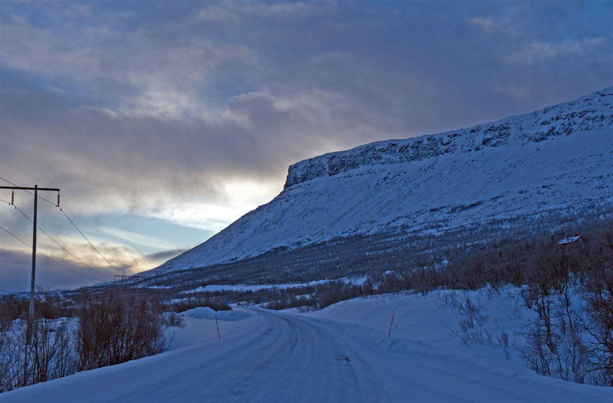 Von der leicht erhöhten Lage sieht man über die Stadt Kiruna und auch auf das Abbau Gebiet des Eisenerzes. Es ist bei so einem Wetter ein schöner Ausblick. Nach einem kurzen Photohalt zog ich weiter. Die Strassen sind nun Schneebeckt und auch Eisig. Aber kein Problem zum Fahren. Einzig beim Kreuzen mit den schnellen 60- Tönner ist Vorsicht geboten. Die Aussicht auf der Fahrt einfach unbeschreiblich. Mit sieht die runden Berge von der Sonne angestrahlt zum Teil in Wolken. Das Panorama vor meiner grossen Scheibe wechselte im Minutentakt. Es hatte praktisch kein Verkehr sodass ich die Fahrt geniessen konnte.