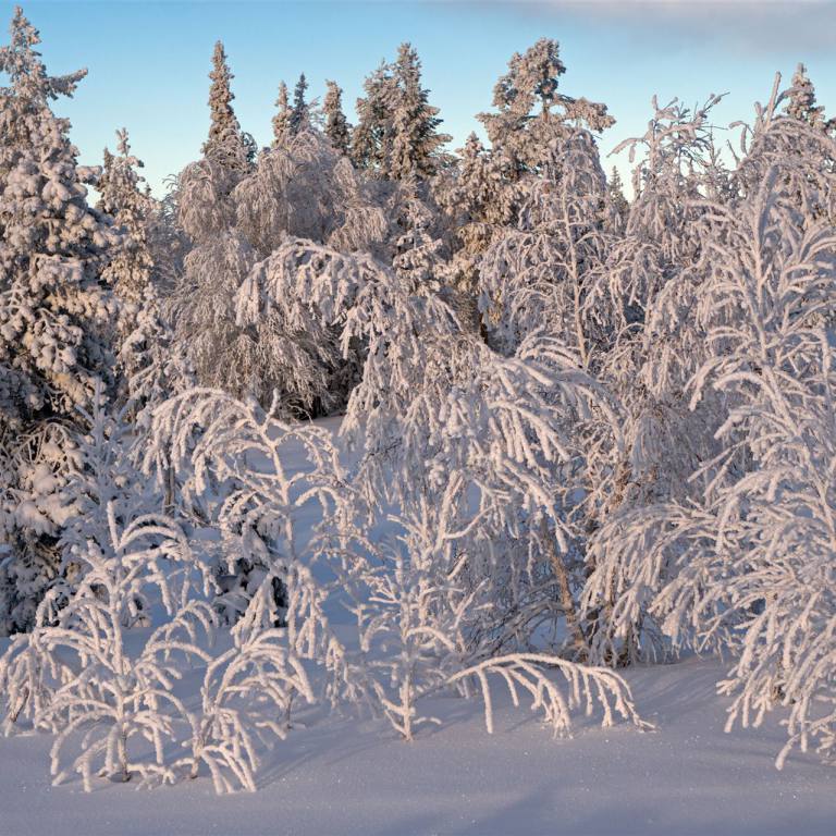 Am Morgen war es Hochnebelartig bewölkt. Teilweise drückte die Sonne durch kleine Löcher am Firmament. Nach dem Frühstück ging es das erste mal seit zweieinhalb Wochen Richtung Süden. Ich bin früh losgefahren. Früh heisst um 09.00 Uhr. Der erste Teil des Weges war gut befahrbar. Es hatte Schnee und Eis auf der Strasse aber recht griffig. Unterwegs sah man in der Ferne Berggipfel die von der Sonne erleuchtet wurden. Es war mit den Eiskristallen auf den kurzen Birken ein herrliches Bild. Man sah die Kälte ohne sie zu fühlen. Es war- 17°C.