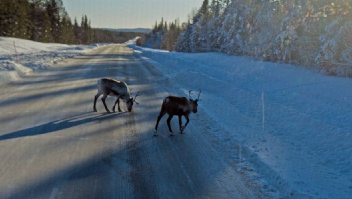 Unterwegs wurde ich noch von zwei Lappländern ausgebremst. Zwei Rentiere spazierten gemütlich auf der Strasse. Das ist sehr gefährlich vor allem in der Nacht. Ich habe bereits drei tote Rentiere gesehen. Der Staat zahlt für den Verlust.