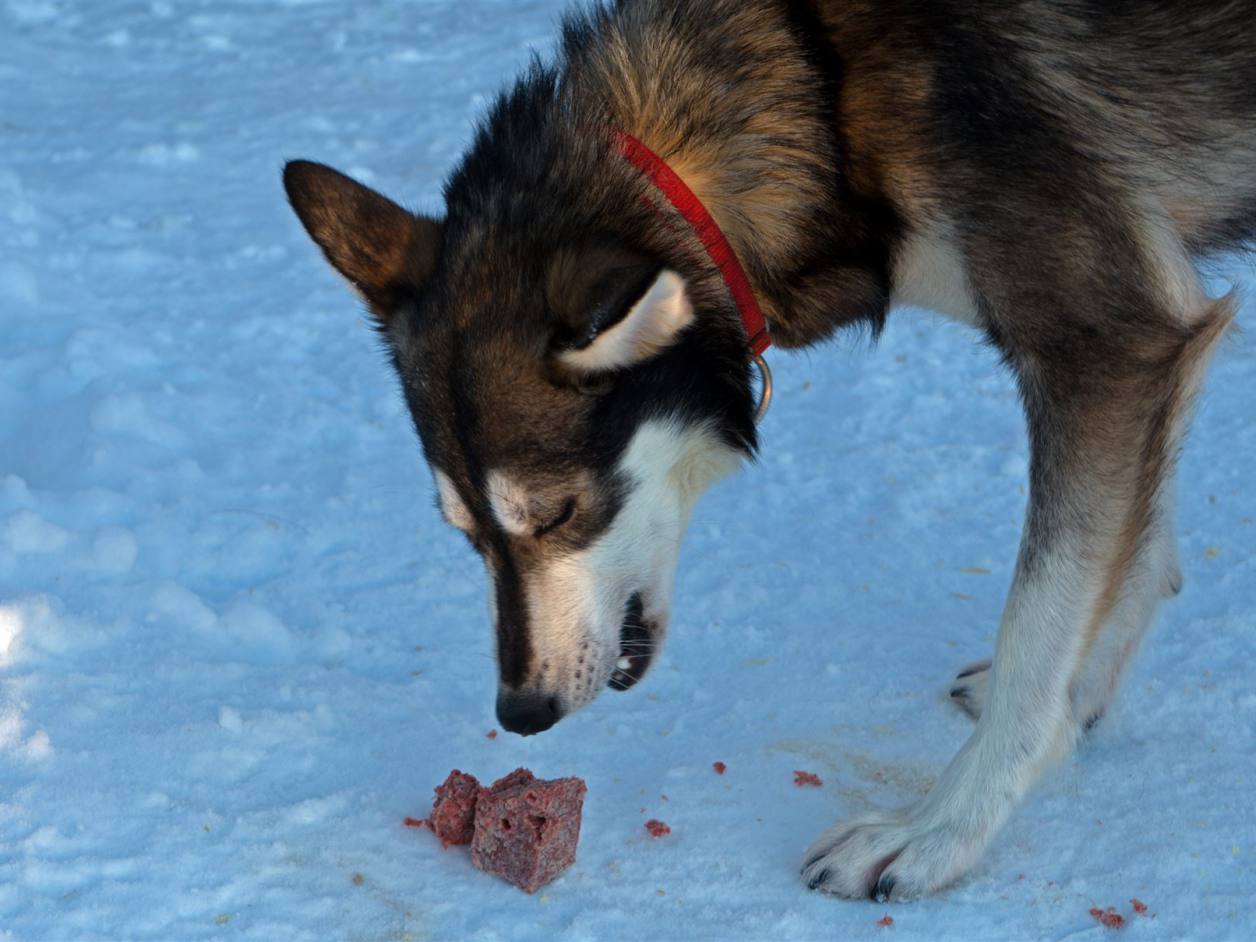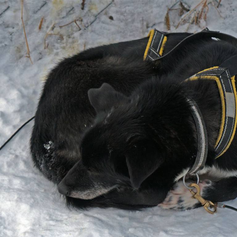 Nun traten wir den Rückweg an. Wieder ging es über Seen und durch Wälder. Nun waren wir langsam geübt und waren schon beinahe Profis im Mushern. Nach eineinhalb Stunden erreichten wir unser Camp wieder. Nun galt es die Hunde zu versorgen. Zuerst ausspannen das Zuggeschirr ausziehen. Sie waren ruhig und liessen unsere ungelenken Bewegungen über sich ergehen. Nun gab auch noch nahrhafte Fleischsuppe. Sie hatten Durst liefen sie doch auf und Abwärts immer mit 90 Kg plus Schlitten. Wie stark so ein Leithund ist hatte ich am Start nach Pause zu spüren bekommen. Mein weisser Husky springt immer wieder in die Höhe und man muss ihn am Boden halten sonst gibt es einen Durcheinander mit der Leine. Ich konnte ihn kaum halten. Beim Entfernen des Geschirrs war aber wie ein Lämmchen. Das war ein traumhafter Tag mit wunderschönen Landschaften und lieben Tieren, die mich 3 Stunden fortbewegten.