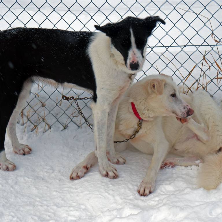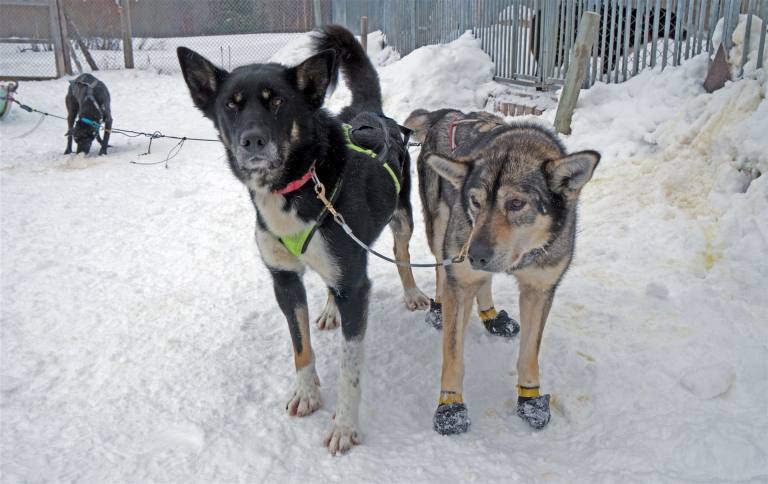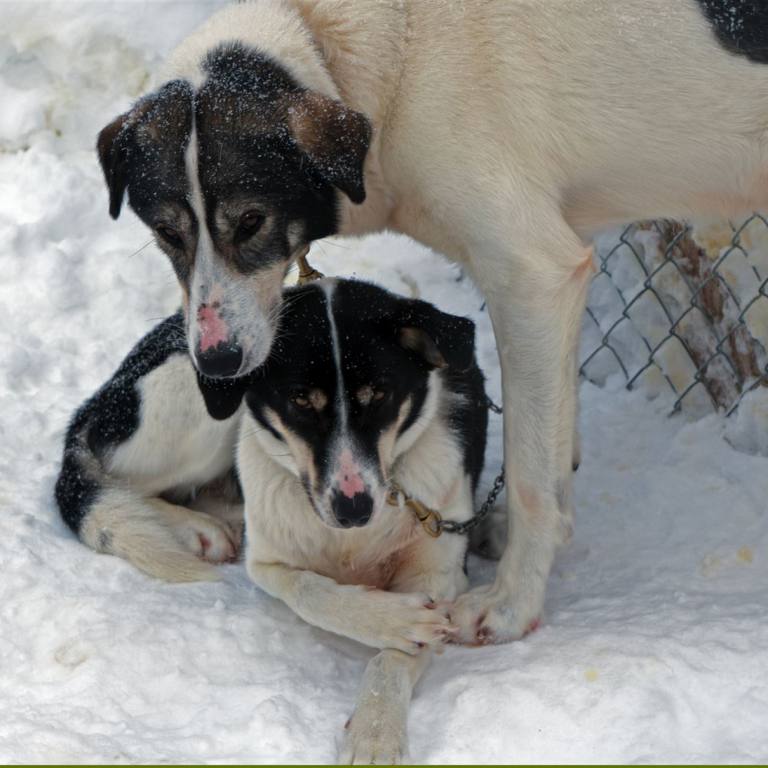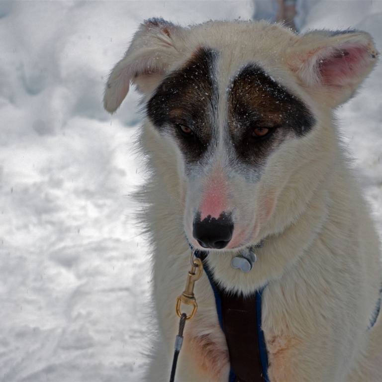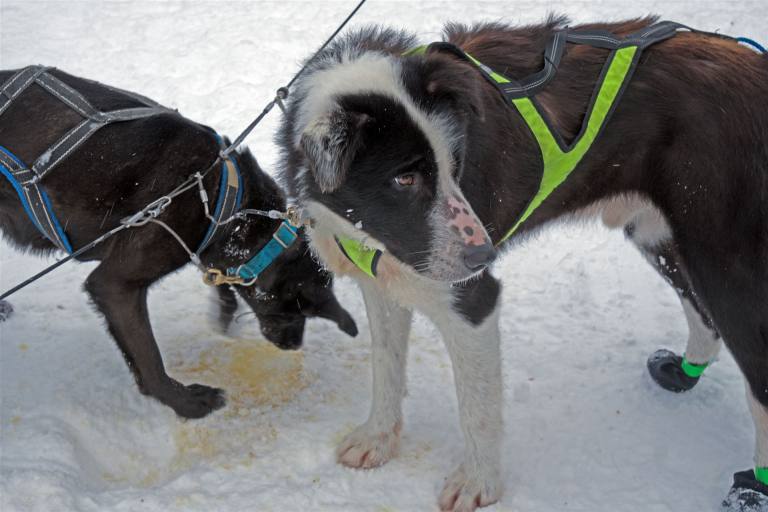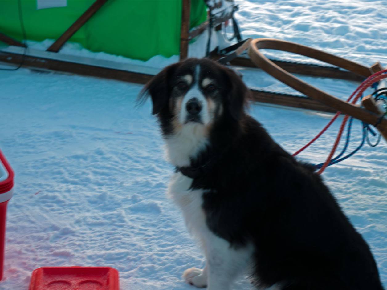 Heute war der grosse Tag. Nach dem Frühstück wurden wir mit warmen Sachen eingekleidet. Dann instruierte Nadja uns über das Mushern. Nach einer halbstündigen Einweisung durften wir zu den Gespannen gehen, die bereits bereit standen und sehnsüchtig auf das Laufen freuten was man unhörbar sah.
