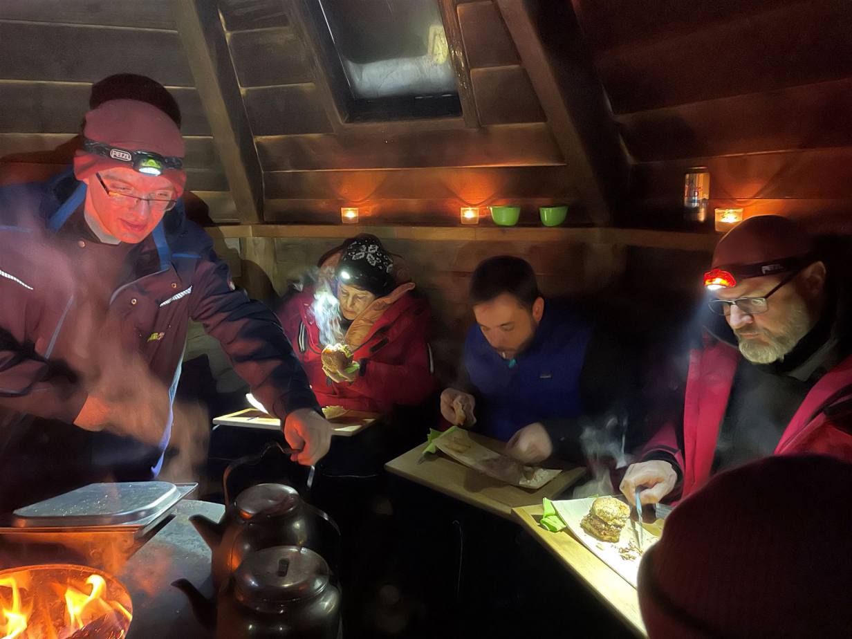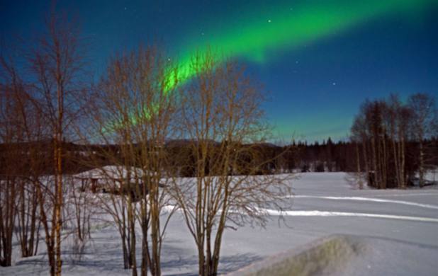 Serviert wurde das ganze auf einem gewölbten Holzbrettchen mit Salat, Kartoffelspalten und div. Saucen. Es war sehr Dunkel im Raum nur das Feuer gab etwas Helligkeit. Damit wir das Essen auf unseren Knieen sahen benutzen wir unsere Stirnlampen. Es war ein lustiger Abend ziemlich im Dunkeln. Unsere Leuchten waren wichtig damit man dass Essen sehen konnte. Durch das Feuer brachte Wärme. Draussen lag die Temperatur bei - 16°C. Wir wollten noch das Nordlicht schauen. Die Intensität war aber sehr schwach und der Himmel zeigte sich nicht von seiner besten Seite.
