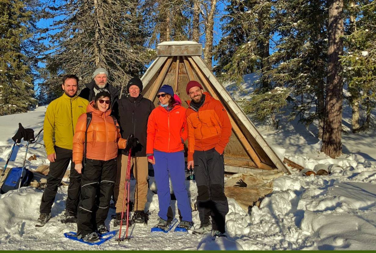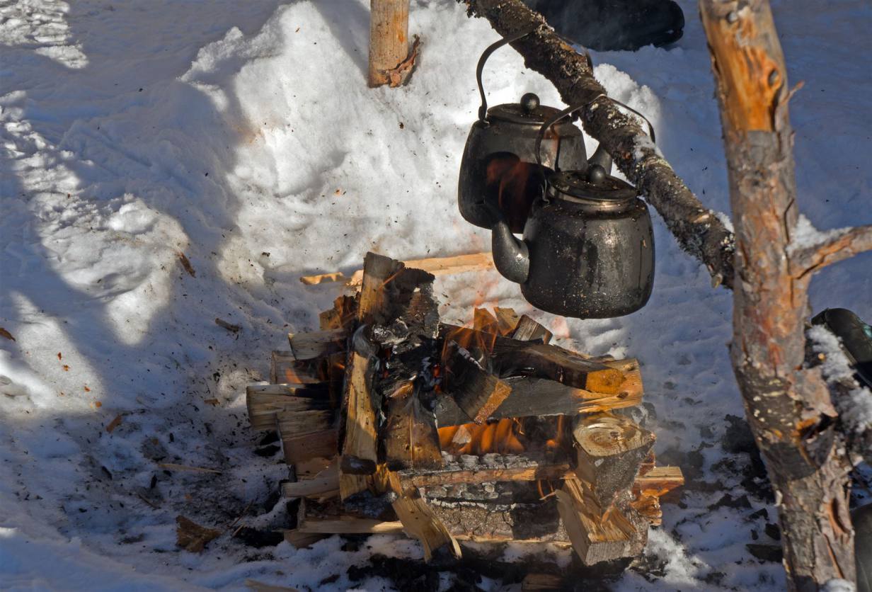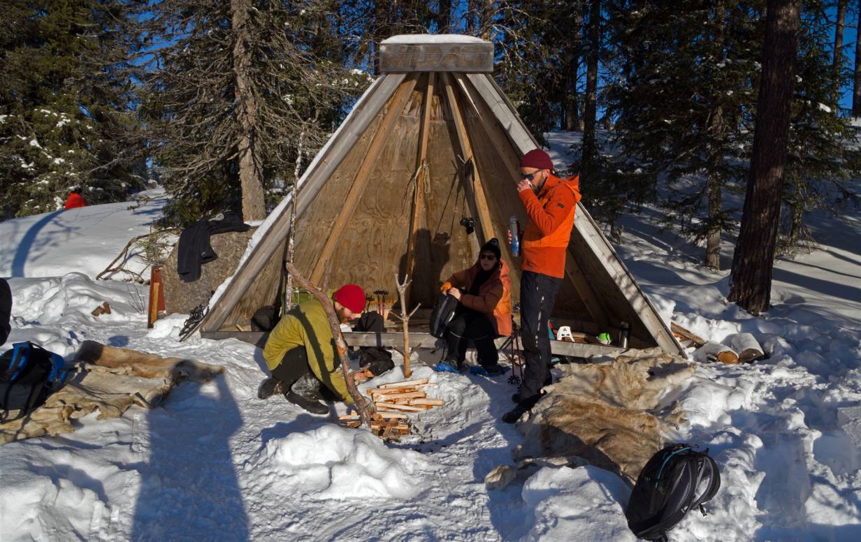 Gegen Mittag erreichten wir einen Unterstand den Wildact für die Wanderung gebaut hat. Es hatte eine Feuerstelle und Holz war in einer geschlossenen Truhe bereitgestellt. Johannes Kormann unser Guide erkläret uns unterwegs die verschiedenen Tierspuren. An Ort begann er Feuer zu machen, packte das Essen aus das er im Rucksack mitgetragen hatte und bereitete alles vor. Wir konnten zuerst mal ausruhen. An der Sonne war es wunderbar warm obwohl die Temperaturen bei - 8°C lagen.
