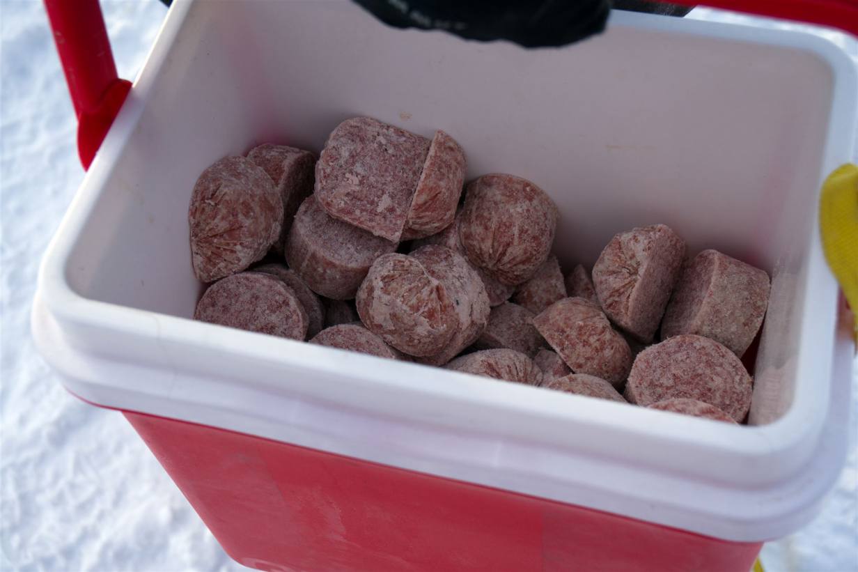 Der Halt war dann auch eine langwierige Angelegenheit. Die Tiere wurden abgehängt und an einer langen Leine befestigt. Jetzt war absolute Ruhe. Sie bekamen eine kleine Stärkung in der Form von gefrorener Wurst. Wir begaben uns dann in die Hüte wo das Feuer schon brannte. Ein Doghandler hatte alles vorbereitet. Er bewachte auch die ganze Meute während wir in der Hütte eine gute Elchsuppe und Kaffee und Gebäck genossen. Man hörte kein Heulen oder Gebell. Absolute Ruhe Draussen.