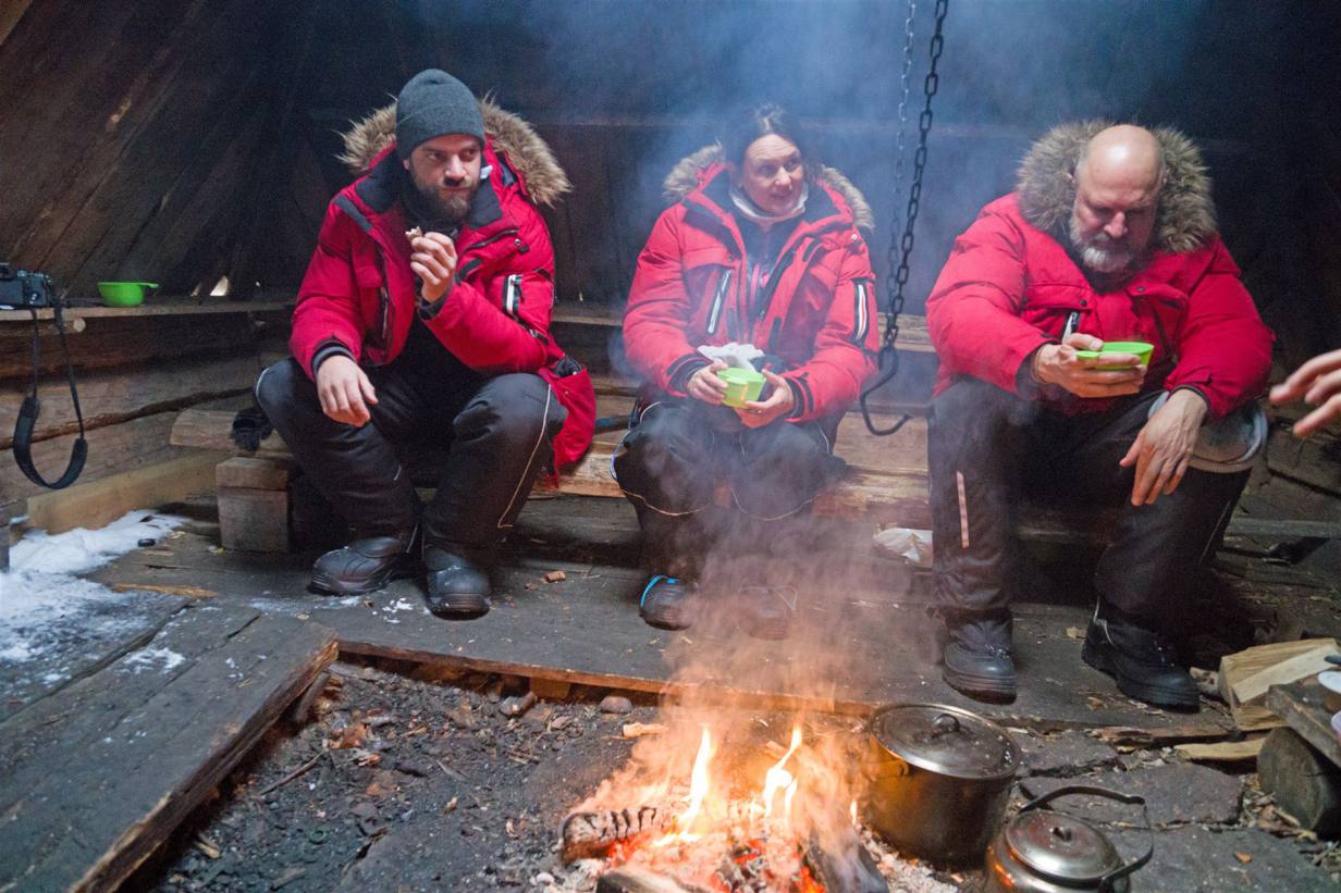 Das Feuer brannte und Johannes machte die Kaffeekessel bereit. Wasser holt man aus dem See, muss zuerst aber noch ein Loch bohren. Zuerst packte unser Guide warme Suppe aus, die er mitgetragen hatte. Wir haben Teller. Tasse und Besteck mitgenommen im Rucksack. Da schmeckte schon mal sehr gut. Das Kaffeewasser erwärmte sich über dem Feuer. Gleichzeitig bekamen wir Rentierwurst zum braten. Die würzige Wurst schmeckte sehr gut. Am Schluss kochte das Wasser und Johannes setzte das Kaffeepulver in die Kanne nun noch kurz aufkochen und der Kaffee war fertig. Tuulia sieht sich nun ihrer Meinung bestätigt, das gibt den besten Kaffee. So macht sie das täglich zu Hause aber nicht auf einem Feuer. Wir sind bereits in der modernen Zivilisation angekommen und haben eine Herdplatte.