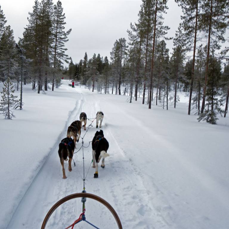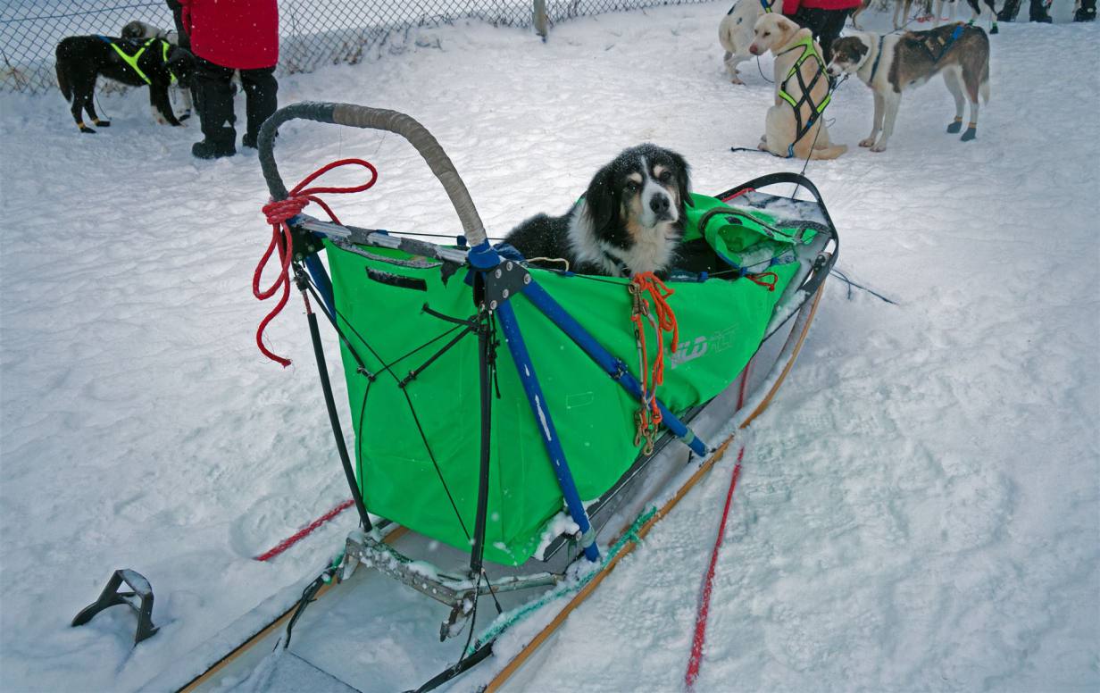 Es braucht eine Weile bis alle Hunde bereit sind. Die einen brauchen noch Schuhe wegen dem agressiven Schnee alle Gespanne müssen vorbereitet werden zum Starten. Das ist ein ziemlich schwieriges Prozedere weil sie alle wie wild heulen und drängen damit es endlich los geht. Dann ist es soweit. Einer nach dem anderen startet. Nun will jeder schneller sein als der andere. Man muss auf der Bremse stehen bis sie sich angewöhnt haben und wach sind. Dann geht es durch wunderschöne Gegenden, durch Wälder über Seen und unendliche baumlose Flächen. Wir haben Glück gehabt. Es ist bissig Kalt - 17°C aber es weht kein Wind. Unsere dicken Kleider und Schuhe sind aber hervorragend und man kommt nicht zum Frieren.