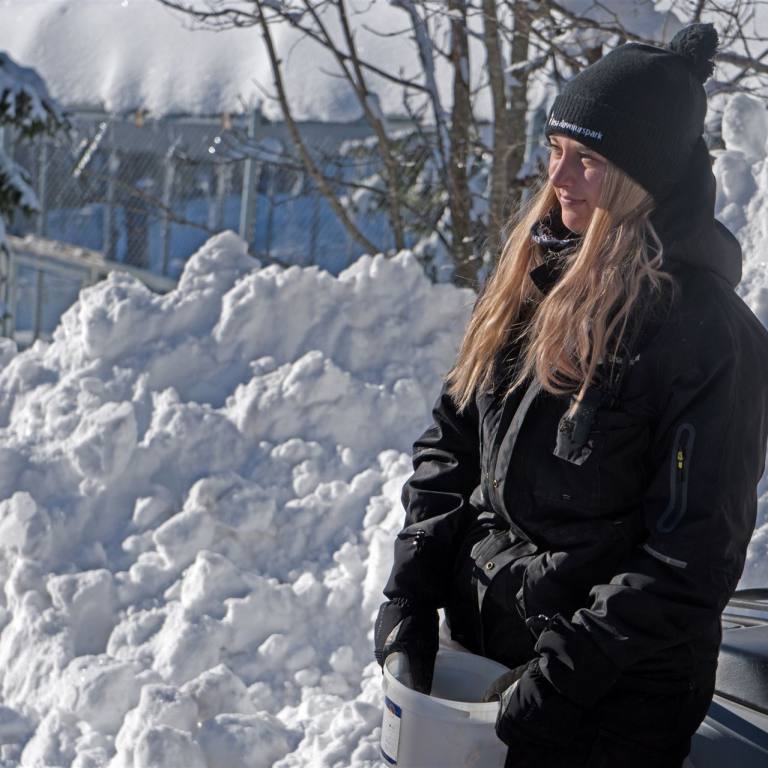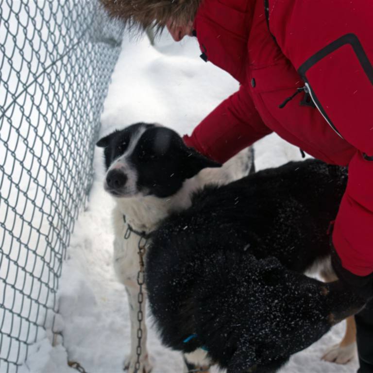 Noch ein paar Worte zu unserem Guide. Egal ob beim Wandern, Zelten, Eishockey spielen, Fotografieren, Reiten, Kajak fahren oder Biken, Nadja Isenschmid ist vielseitig unterwegs und probiert immer wieder gerne Neues aus. Begleitet wird sie bei den meisten Aktivitäten und Reisen von ihrer Border Collie Mischlingshündin Maïly. Vernarrt in die Natur, das Draussen sein und vor allem aber in Hunde, hat sie neben dem Sportstudium als Hundetrainerin gearbeitet und immer davon geträumt einmal einen Winter mit Schlittenhunden im Norden zu verbringen. 2013 hat sie sich diesen Traum in Finnland erfüllt und für vier Monate mit Alaskan Huskies und Pferden gearbeitet. Seither haben sie die Gedanken an den Norden und die Hunde nicht mehr losgelassen. Nach dem zweiten Studium als Primarlehrerin hat sie die Schlittschuhe, die Eishalle und das Klassenzimmer gegen den Hundeschlitten und die Winterlandschaft des Nordens getauscht und arbeitet nun seit 2019 bei Wildact als Doghandler und Huskyguide.Guide. Diese liebenswerte Frau hat sich in Huskys verliebt. Der Umgang mit der Natur und den Hunden ist vorbildlich und man sieht ihr die Freude an der Arbeit an. Nach eineinhalb Stunden trafen wir an einer Samenhütte ein wo wir den grossen Mittagshalt machten.