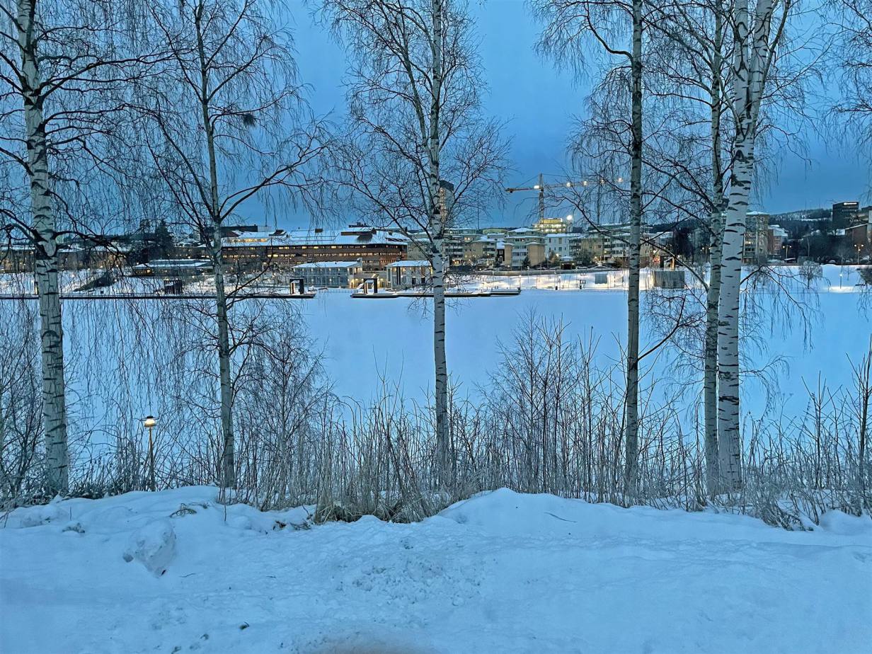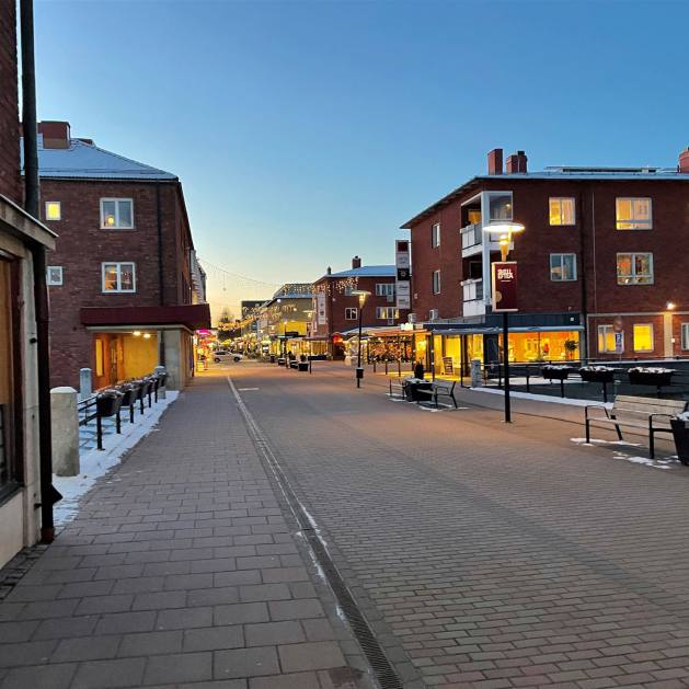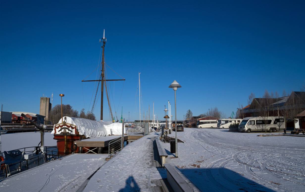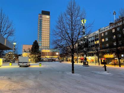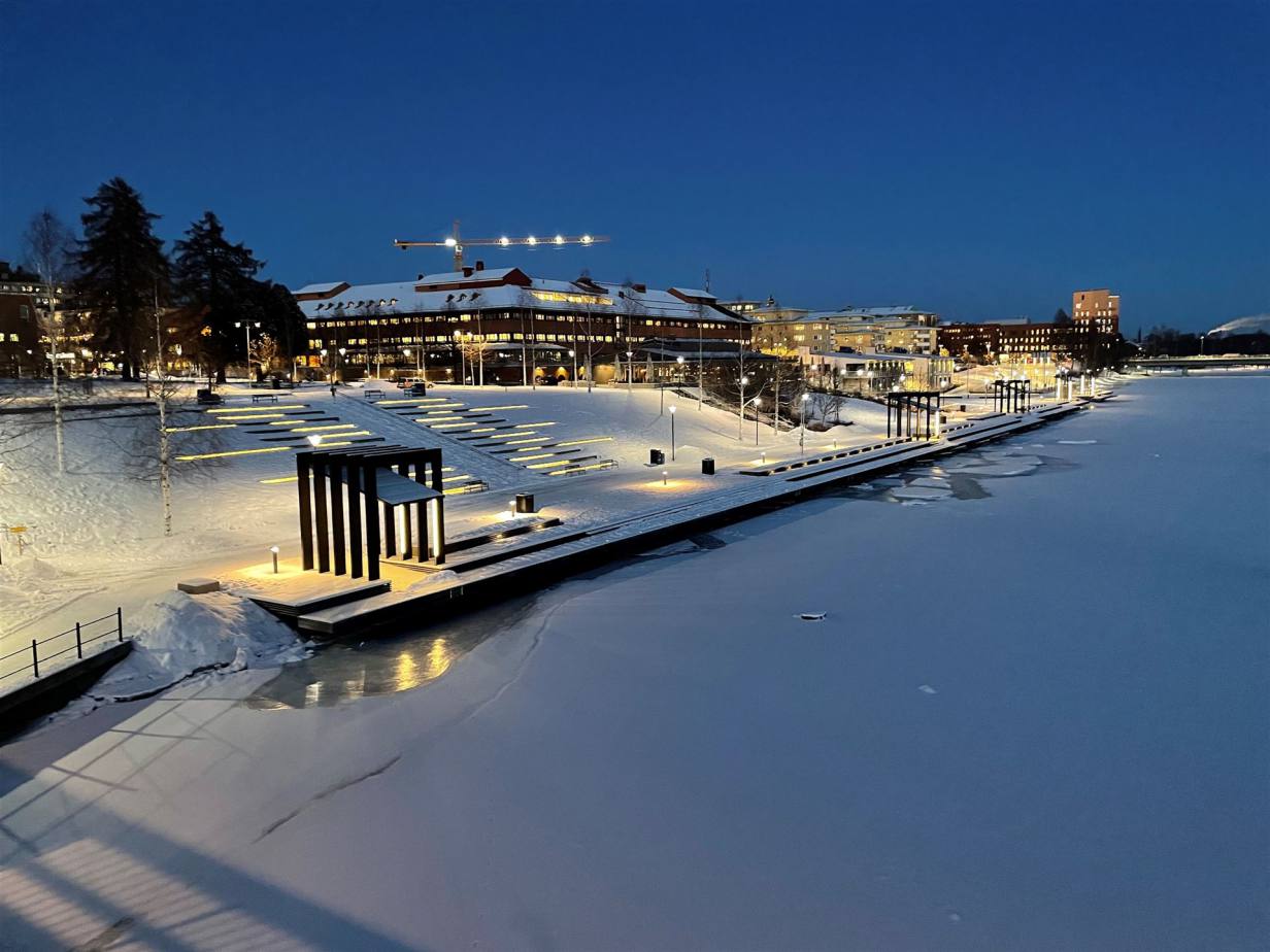 Nach einer halben Stunde ging es weiter. Ohne Halt machte ich die restlichen Kilometer bis Skelleftea. Eingangs der Stadt gibt es wie überall in Schweden grosse Einkaufsgeschäfte. Ich sah einen COOP aber Schwedisch der ein Restaurant hatte. Also suchte ich das Lokal im Coop und genoss das Mittagbuffet um 14.00 Uhr. Ich hatte mir einen Stellplatz in der Stadt ausgesucht. Er liegt auf der anderen Seite des zugefrorenen Flusses und ist auf dem Camp der Universität von Skelleftea. Hier hat es top Moderne Zimmer, Mensa und Hörsäle. Der Campus ist auf einer grossen Fläche angesiedelt. Umeå liegt die Innenstadt ungefähr auf der Höhe des Flussufers, in Skellefteå rund zehn Meter darüber. Und wie toll man diesen Niveauunterschied in Skellefteå genutzt hat! Hier haben Landschaftsarchitekten ganze Arbeit geleistet und eine wunderschön terrassierte Anlage entworfen – mit Park, Restaurants, Cafés, Skulpturen, Beachvolleyballfeldern, Kinderspielplatz und vor allem ganz vielen Sitzgelegenheiten und Sonnenliegen. Die Stadt ist sehr Modern gebaut. Ich hatte die Gelegenheit um 16.00 Uhr noch einen Spaziergang zu machen leider bereits bei Dunkelheit.
