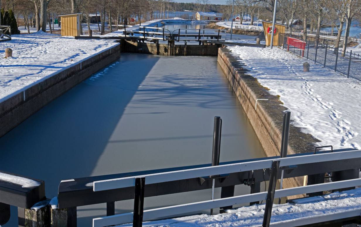 Es hatte auch heute Morgen viel Verkehr auf den Strassen. Diese waren teilweise noch mit Schnee bedeckt. Nach 60 km sah ich eine braune Tafel was eine Sehenswürdigkeit bedeutet. Sjötorp stand drauf und wies auf den Götakanal hin. Also kurz rechts abfahren und schon stand ich auf dem Parkplatz der Leer war. Der Kanal hat eine leichte Eisschicht und ist im Winter nicht in Betrieb. Am Ortseingang von Sjötorp in Västergötland liest man: “Hier beginnt der Göta Kanal.” Wenn man Schweden von West nach Ost per Schiff durchquert, ist diese Behauptung in doppelter Weise korrekt: geographisch und historisch. Am Ostufer des Vänern bei Sjötorp liegt nämlich nicht nur der Anfang des Göta Kanals, hier begannen im Jahr 1810 auch die Bauarbeiten an dem gewaltigen Projekt. Direkt an der Brücke über den Kanal steht ein großer Gedenkstein. Der Göta Kanal wurde 1832 fertiggestellt und gilt bis heute als Schwedens größtes Bauvorhaben aller Zeiten. Bei Sjötorp bringen acht Schleusen die Schiffe vom Vännernsee in den Kanal. Der Götakanal hat gesamthaft 58 Schleusen und ist 190 km Lang.