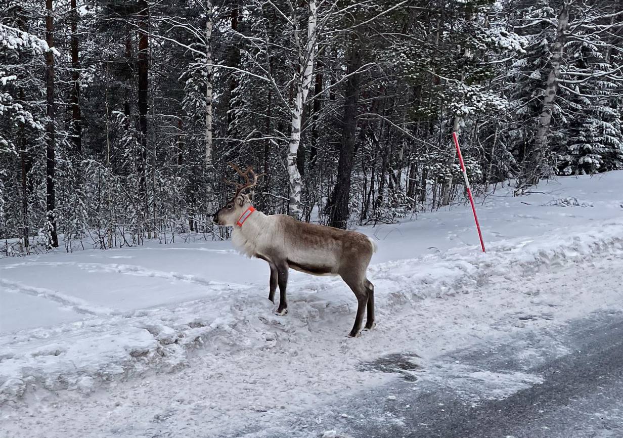 Nach dem Frühstück brach ich auf und benütze noch 70 km die E06. Bei Pitea bog ich ab. Nun ging es ins Landesinnere. Nach dem es in Skelleftea noch - 10°C war ging das Thermoter von km zu km weiter zurück. Mein Thermometer zeigte kurzfristig - 20°C an. Ich merkte davon nichts, da im Wohnmobil herrlich warm war. Plötzlich wurde ich von LKW mit Lichthupe gewarnt. Ich konnte mir schon vorstellen was das zu bedeuten hatte. Rentier Alarm !! ich habe eigentlich noch keine erwartet. Bereits einige Kilometer davor hatte ich schon fünf in der Nähe der Strasse gesichtet. Ich war desshalb bereits vorsichtig zumal die Strasse nicht gerade zum schnell Bremsen taugte, es hatte wenig Schnee darauf. Nach einigen Kilometer dann wirklich ein einzelnes Rentier auf der Strasse.