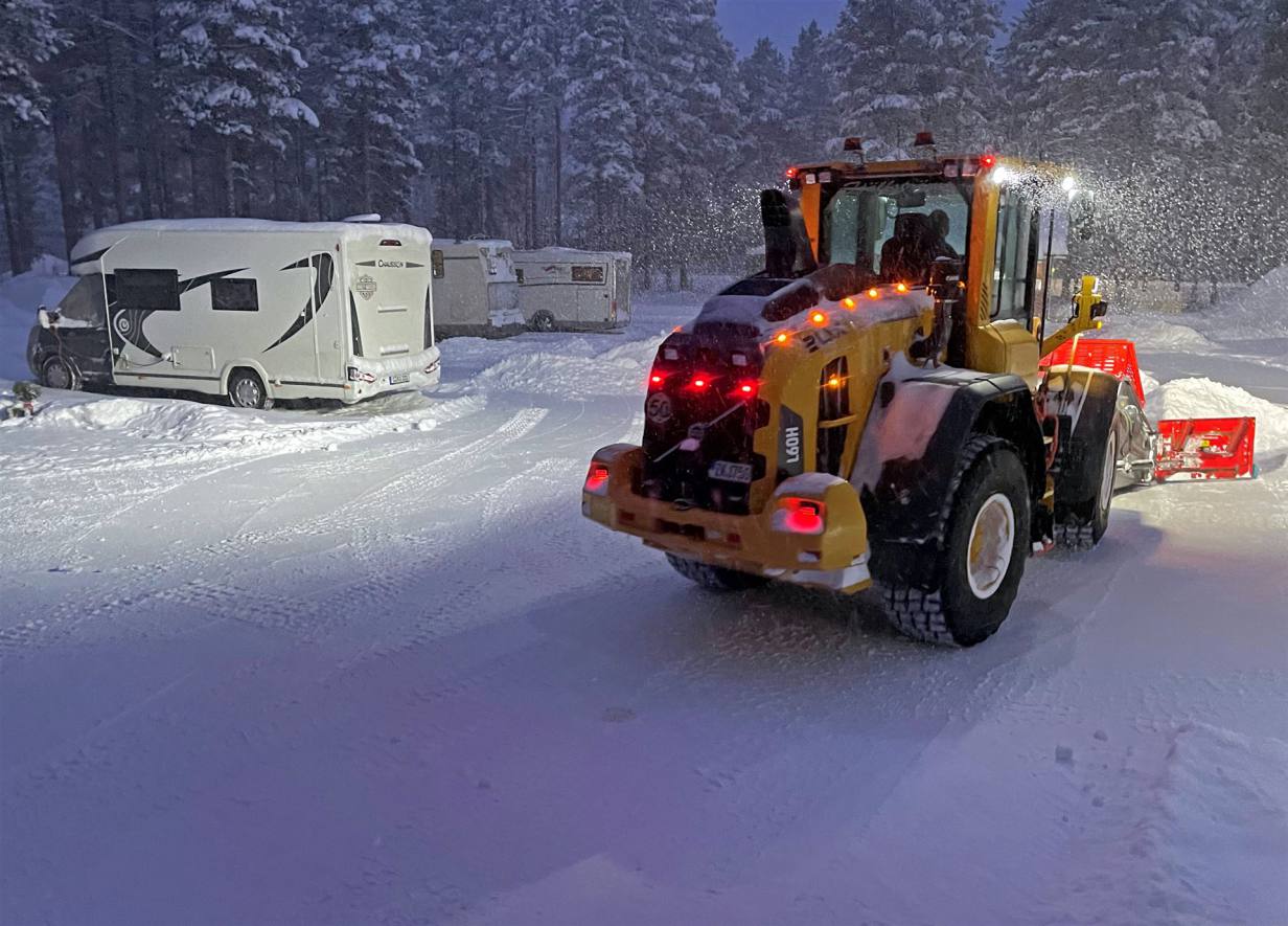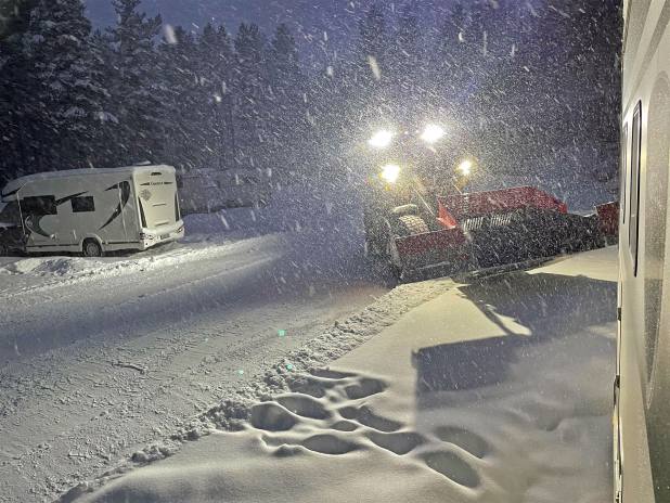 An der Teams Sitzung wurde ich von meinem Bruder darauf Aufmerksam gemacht, dass er nie etwas von Kaffee und Kuchen gelesen hat. Tuulia ist eben nicht auf der Reise dabei. Mit ihr bin ich meistens in ein Kaffee mit gutem Gebäck oder Kuchen gegangen. Sie wollte nicht immer im Wohnmobil sein und etwas Abwechslung haben. Bei mir ist die Ausgangslage etwas anders. Ich habe mir Kaffee meistens im Wohnmobil gemacht. Tuulia hat mir ja auch noch eine Schachtel mit Weihnachtsgebäck mitgegeben. Es ist aber nicht so, dass sie die treibende Kraft ist, ich geniesse auch jeden Tag wie auf dem Bild einen Mittagskaffee oder etwas Eis aus der Schachtel die ich mir gekauft habe. Damit wäre das auch abgehackt. Um vier Uhr dann wieder Aufregung auf dem Platz. Der Schneepflug hat uns den Weg und den Platz wieder von 20 cm Neuschnee befreit. In der Dunkelheit ein imposantes Schauspiel. Mit den starken LED Lampen leuchtet er den ganzen Platz aus.
