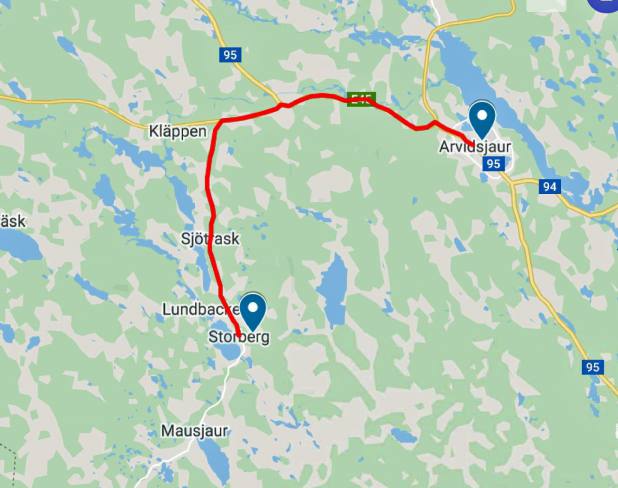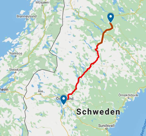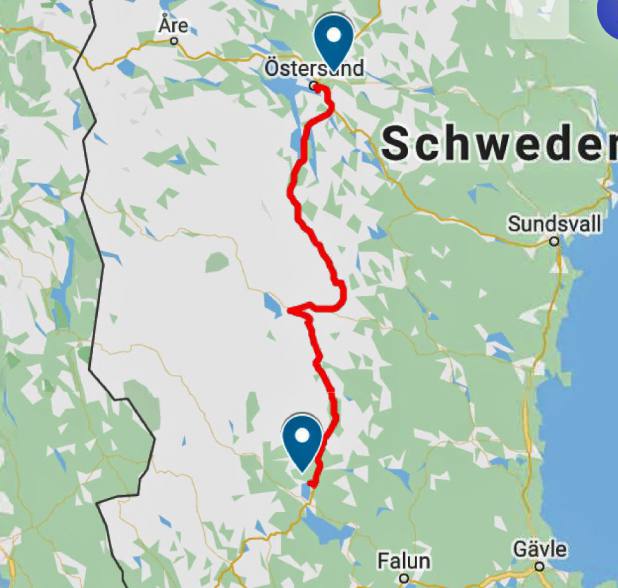 Nach einer halben Stunde ging es weiter. Die Strasse meistens mit Schnee und Eis bedeckt. Es gibt aber keine Probleme beim Fahren, da die Schneepflüge mit ihren Spitzen Rillen in den Belag geritzt haben. So ist der Grip gut. Durchschnittstempo gut 70 km. So war ich relativ früh in Sveg. Dort hat es ein grosses Zentrum mit Tankstellen und Geschäften. In einer Sporthalle hat es ein Restaurant das Mittagessen anbot. Ich nutzte die Gelegenheit und habe Mittag gegessen. Unterwegs habe ich mich entschieden nicht direkt nach Mora zu fahren, sondern in Orsa den Camping am See zu benutzen.