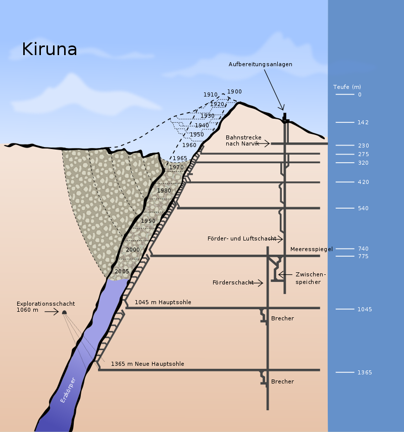 Jährlich werden 26 Millionen Tonnen Roherz aus der Grube gefördert, mit dem Ausbau der neuen Hauptsohle auf −1365 Meter soll die Produktion auf 33 Millionen Tonnen Roherz erhöht werden. Aus dem Roherz werden 19 Millionen Tonnen Fertigprodukte hergestellt, wobei der größte Teil als Pellets versandt wird. Für den Transport zu den Häfen Narvik und Luleå wird die schwedische Erzbahn benutzt. Der rasante Abbau hat aber auch folgen für die Stadt. Seit 2014 gibt es einen Plan für die schrittweise Verlegung um fünf Kilometer nach Osten. Sie soll bis ins Jahr 2033 dauern. Widerstand aus der Bevölkerung gibt es dagegen kaum. Alles eine Frage der Erziehung - schließlich arbeitet ein großer Teil der Bewohner Kirunas in irgendeiner Form für die Mine. Viele Einwohner sind bereits in die neuen Einfamilienhäuser oder Wohnblocks umgezogen. Es wurden sogar ganze Häuser auf der Strasse verschoben.