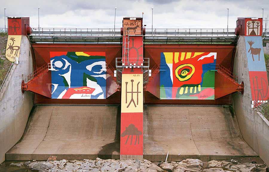 Nachdem ich Rentier Steaks und eine Rentier Wurst und noch einige Kleber eingekauft hatte ging es weiter. Direkt am Ende des Dorfes gibt es ein altes Kraftwerk. Weiter taucht dann ein spezielles Kraftwerk auf. Es wurde von 1969 bis 1973 errichtet. Das Kraftwerk ist im Besitz von Vattenfall und wird auch von Vattenfall betrieben. Das Kraftwerk Akkats ist außerhalb der Ortschaft Jokkmokk gelegen. Akkats ist das Tor zu den „großen Seen“ und zum Weltkulturerbegebiet Laponia. Das Kraftwerk Akkats ist auch eine Sehenswürdigkeit, die bei Touristen sehr beliebt ist. Die Künstler Bengt Lindström, Lars Pirak und Lars Jason Nutti haben dort Monumentalgemälde erschaffen, die den Namen „Dörrarna västerut“ (Die Tore nach Westen), oder samisch „Uvssat davás“, tragen. Sie zieren die Schleusentore des Kraftwerks und symbolisieren den Lebensstil der samischen Bevölkerung, die diesen Teil von Nordschweden in hohem Maße prägt.