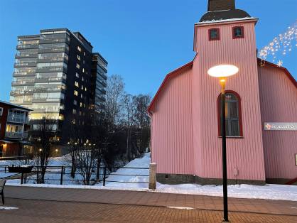 Mir ist beim Blick hinunter noch eine schöne Kirche aufgefallen. Nichts wie runter und dann die Kirche suchen. Ebenfalls etwas erhöht fand ich dann die Schwedische Kirche. Sie sieht sehr schön aus und hat ein Nebengebäude, was man viel sieht in Schweden. Ich konnte nichts erfahren über diese Kirche.