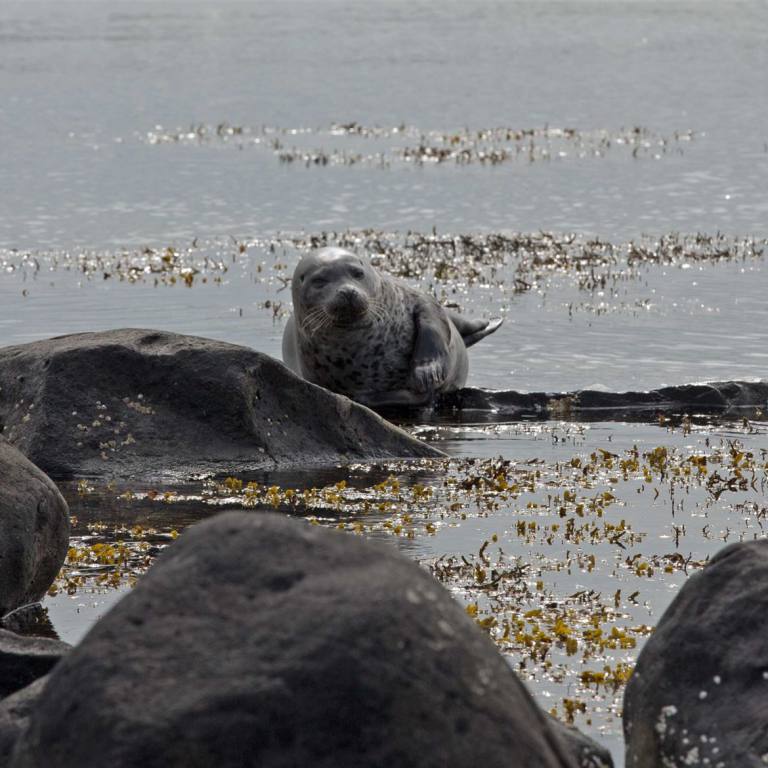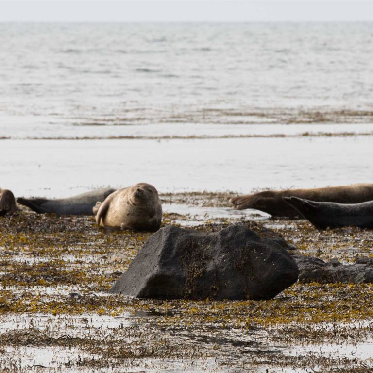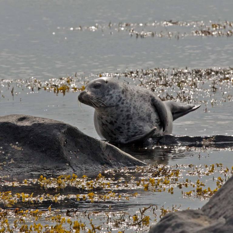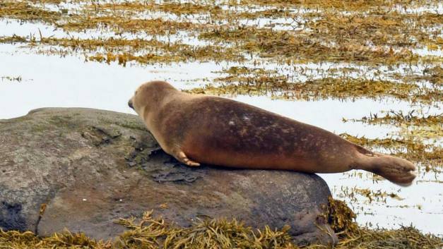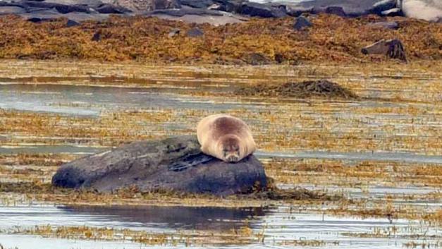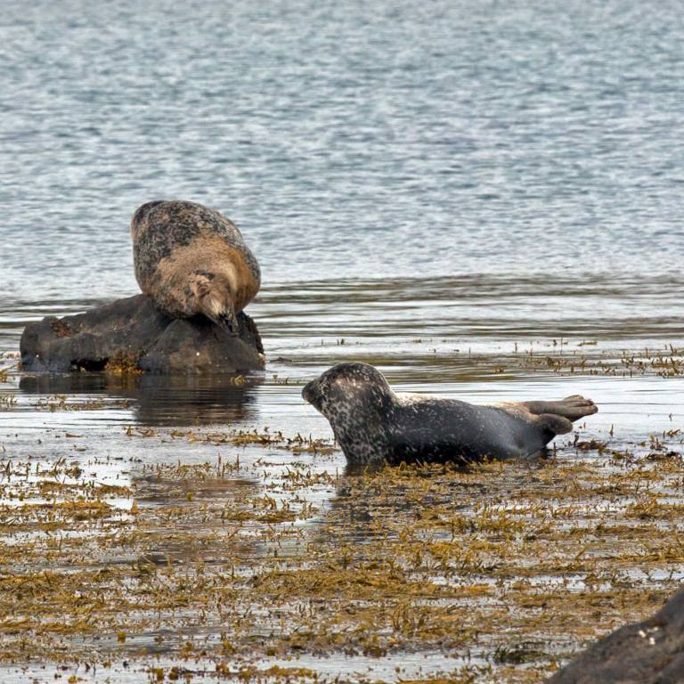 Wir fuhren noch 22 km weiter und waren dann am rechten Ort. Die vielen Touristen zeigten, uns das wir richtig waren. Schon einige male waren Robben angekündigt worden, aber waren wahrscheinlich am Fischfang und nicht für die Touristen am Strand. Der Ytri Tunga Beach auf der Snaefellsnes-Halbinsel ist bekannt dafür, dass sich hier nahezu ganzjährig Robben beobachten lassen. Er gilt als der beste Platz, um auf Island Seehunde zu beobachten, besonders in den Monaten Juni und Juli. Bei Ebbe liegen die Tiere gerne auf den Steinen in der Bucht, während sie bei Flut schwimmen und dann oft nur die Köpfe aus dem Wasser ragen. Auch lassen sich hier immer wieder Klappmützen und Ringelrobben beobachten. Vom Parkplatz aus waren es nur einige hundert Meter zu den Klippen. Und siehe da, die vielen Touristen liessen hoffen, dass doch Tiere zu sehen sind. Sie lagen meistens auf den schwarzen Steinen am dösen. Einige junge tummelten sich im Wasser. Die Beobachtung war etwas für Steinböcke. Man musste über kleine und gross Steine klettern damit man an den Strand mit den Robben kam. Die Anstrengung lohnte sich aber
