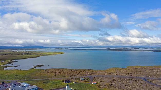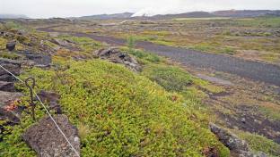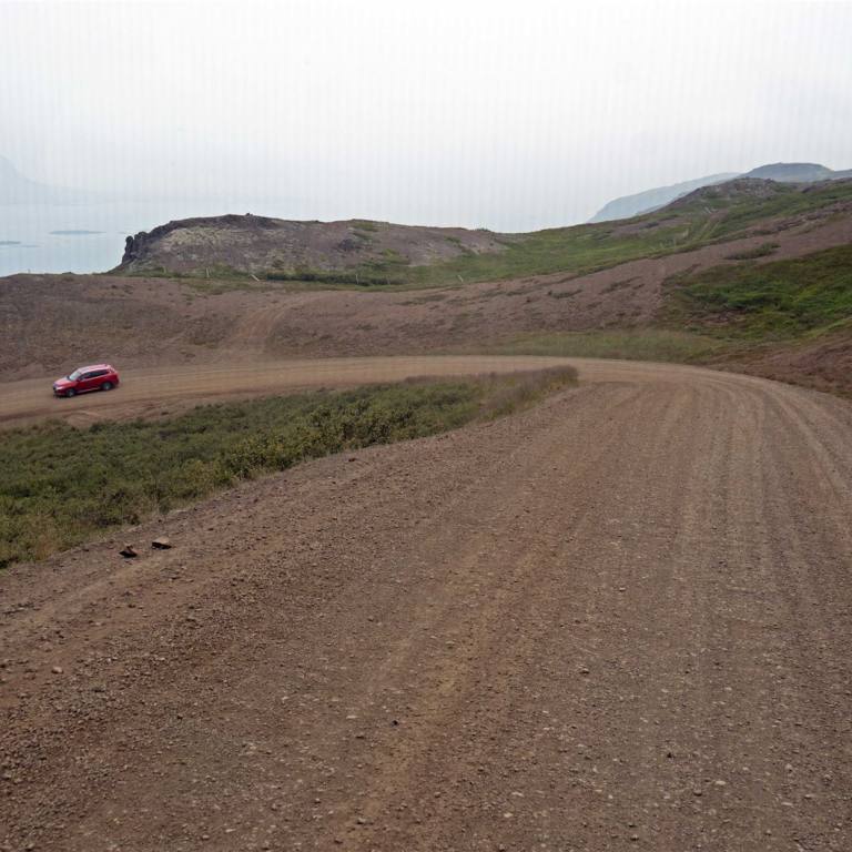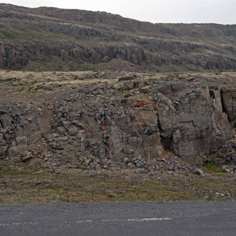 Nach dem Besuch fuhren wir weiter auf der Ringstrasse. Die Strasse führt mit einer 10% Steigung bergauf. Von oben hat man eine herrliche Aussicht auf den Myvatn See, die Dampfschwaden des Geo Thermal Gebietes und des Thermalbad. Hier verläuft auch die Bruchkante zwischen der Amerikanischen und der Eurasischen Kontinentalplatte. Der Riss geht quer durch Island.