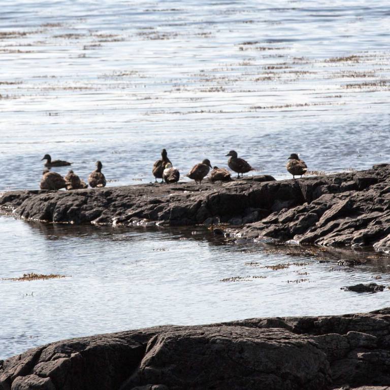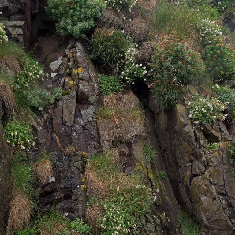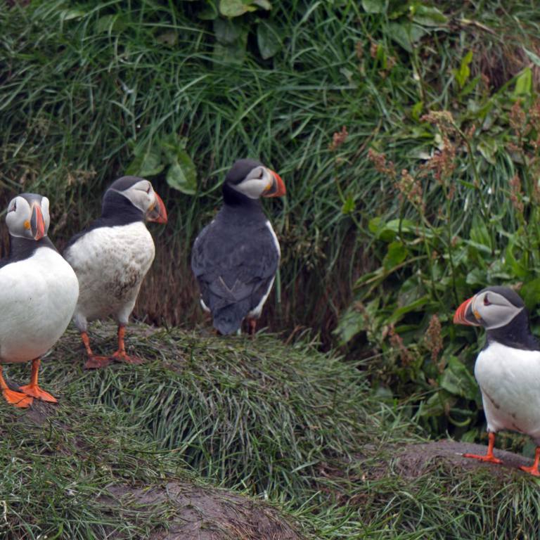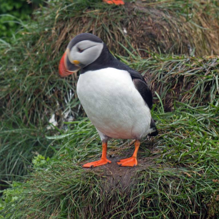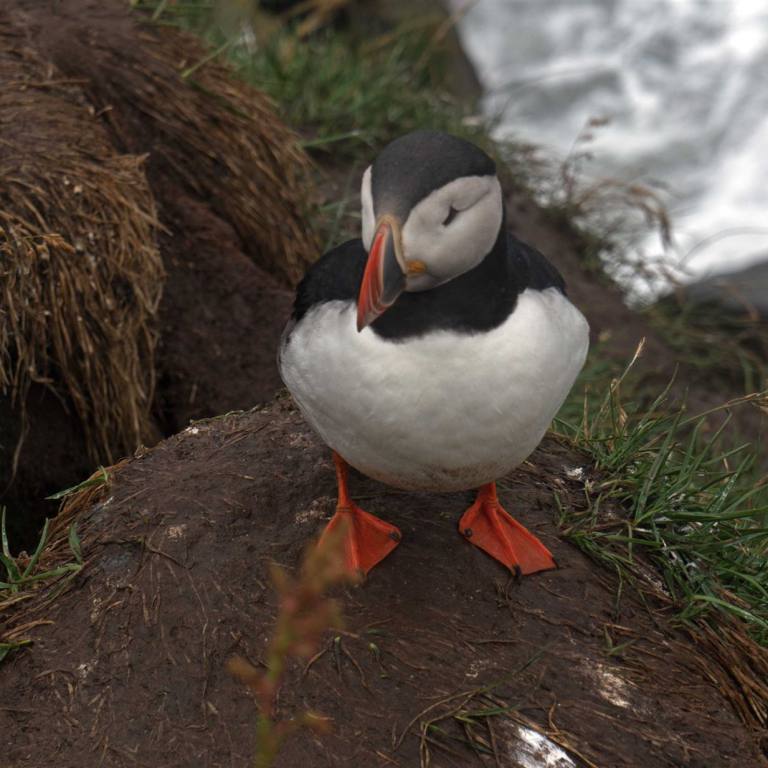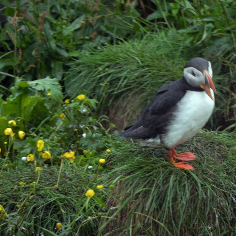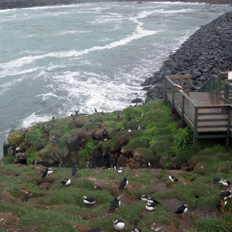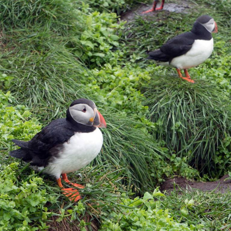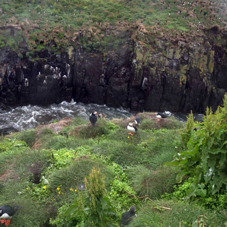 Wenn man vom Parkplatz Richtung Meer läuft sieht man eine Kolonie Papageientaucher die sehr zutraulich sind und sich an den vielen Touristen erfreuen. Lunden wie sie auch genannt werden haben Entenfüsse und einem überdimensional bunten Schnabel. Lunden sind eine der wenigen Vögel, die mehrere kleine Fische quer im Schnabel tragen können, dank eines einzigartigen Gelenkes an ihren Schnäbeln. Dieses Gelenk erlaubt das die obere Schnabelhälfte und die Untere sich in verschiedenen Winkeln treffen, anstatt nur gerade sich schneiden. Die raue Zunge der Lunden kann die Fische an den Rücken des Gaumens drücken, während der Schnabel sich öffnet um noch mehr Fische zu fangen. Lunden können bis zu einer Minute lang tauchen, obwohl sie in der Regel nur etwa 30 Sekunden unter Wasser bleiben. Unter Wasser, lenken sie mit ausgebreitenden Flügeln, dies sieht aus als würden sie fliegen, während die Beine als Ruder dienen. Die Vögel können bis zu 60 Meter tief tauchen.