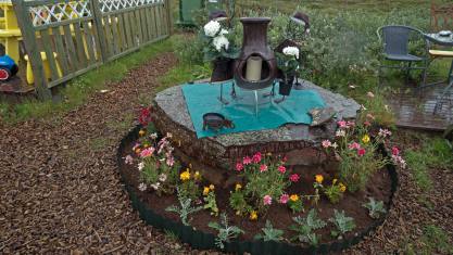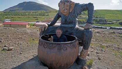 Weitere wenige Kilometer bereits der nächste Halt. Neben einem kleinen Hüttendorf wurde ein lustiger Weg geschaffen, auf dem wir allerlei Interessantes über Elfen und Trolle erfahren. Der Weg ist mit Schautafeln versehen die auf lustige Art und Weise die Geschichte erzählen. Gleichzeitig sind auch verschiedene Objekte verstreut, mit denen man lustige Fotos schiessen kann. Der Pot ist ein kleines Bad mit heissem Wasser. Diese sieht man überall. Sie werden mit heissem Wasser aus dem Boden gespeist. Rund um den Weg sind auch noch ein Restaurant und Thermalbäder zum geniessen bereit.