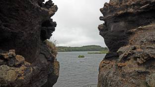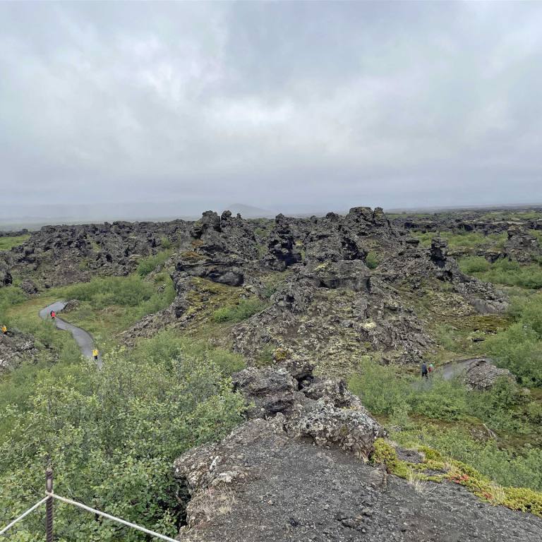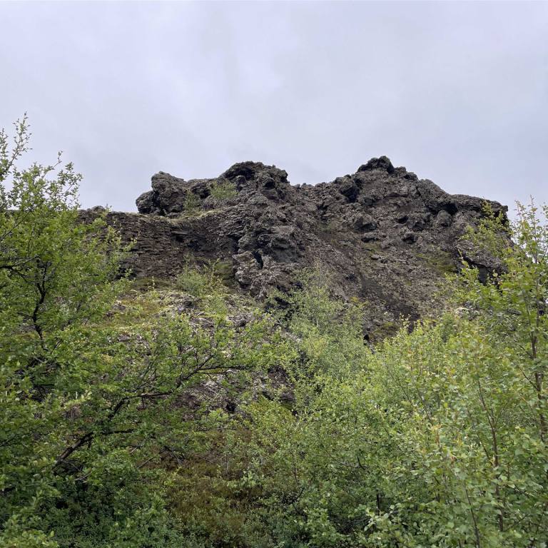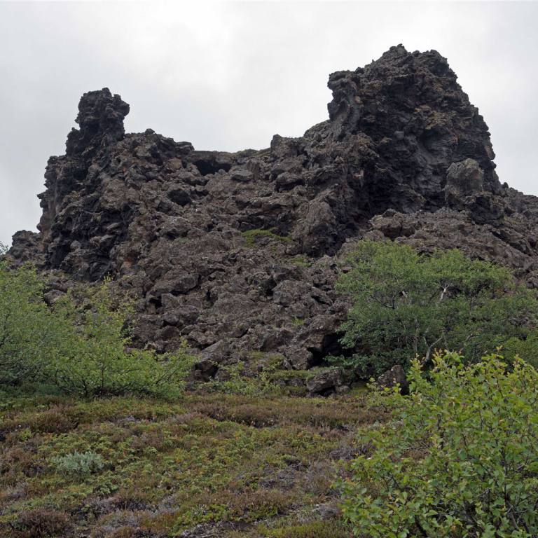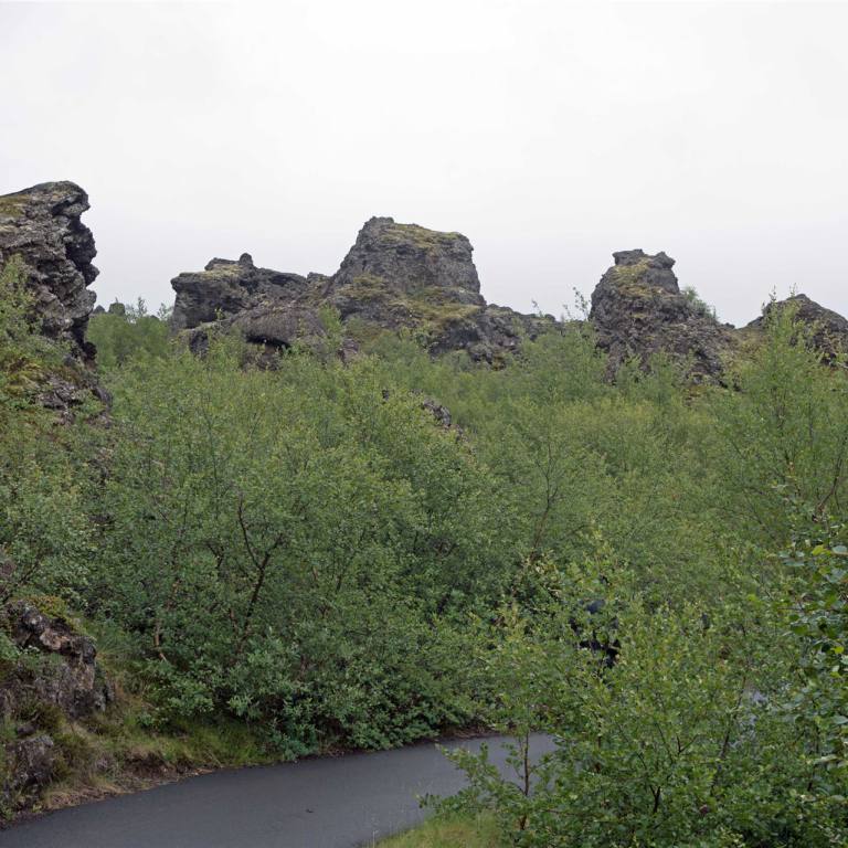 Unsere letzte Etappe war Dimmuborgir. Bei Dimmuborgir handelt es sich um ein Lavafeld und die Überreste eines Lavasees östlich des Sees Mývatn in Island. Es befindet sich in einer vulkanisch aktiven Region auf dem Gebiet des Vulkansystems Krafla, direkt östlich des Sees. Es gibt verschiedene Routen in diversen Längen wo man schön durch die Felder spazieren kann. Dabei kann man sehr bizarre Felsformationen sehen. Sie wurden weder von Wind noch Wasser geschliffen, sondern entstanden durch Eruptionen von Kratern in der Nähe. Viele dieser Felsgebilde haben spezielle Namen, die durch die Fantasie der Isländer entstanden sind, weil sie mit ihrer Form an verschiedene Lebewesen oder Dinge erinnern. Wir spazierten de 2.2 km lange rote Strecke entlang.