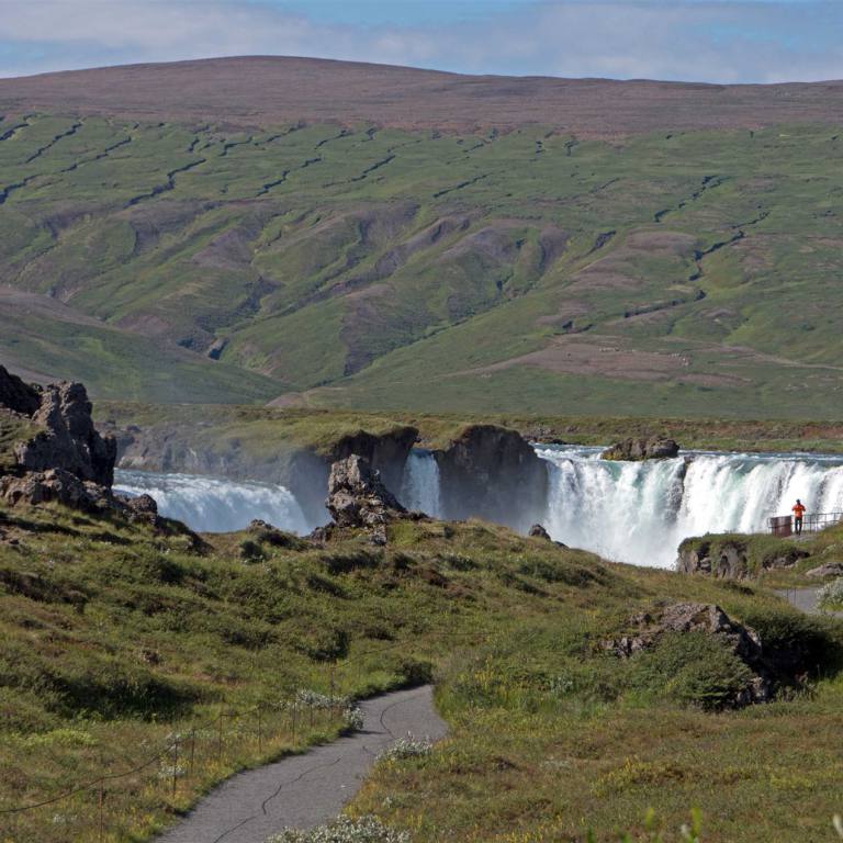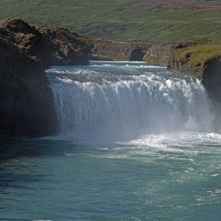 Goðafoss ist einer von Islands wahren Schätzen und einer der größten Wasserfälle Islands.Er wird durch den Fluss Skjálfandafljót gespeist, der durch ein 7000 Jahre altes Lavafeld vom Trölladyngja Vulkan fließt, tröll bedeutet Troll in Deutsch, die Gegend hat also definitiv ein gewissen Mysterium und ist Inspiration für viele Legenden. Der Wasserfall fließt über 30 Meter breite hufeisenförmige Klippen und wird in der Mitte durch Felsen geteilt. Ein Teil ist etwa 9 Meter und der zweite 17 Meter hoch. Wenn das Wasser hoch genug steht, entstehen oft noch andere Wasserfälle, wodurch dieser Ort nur noch magischer wird.
