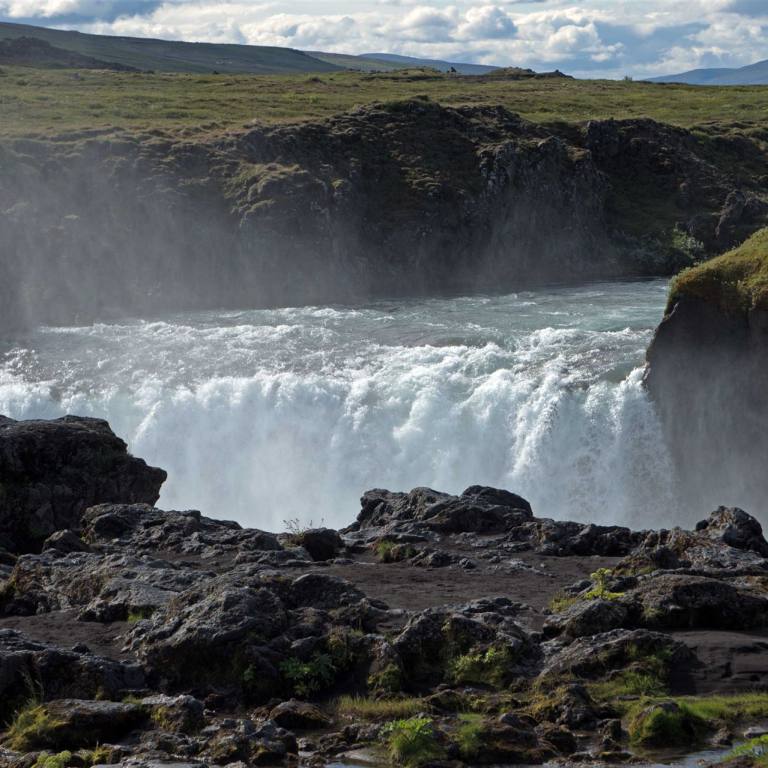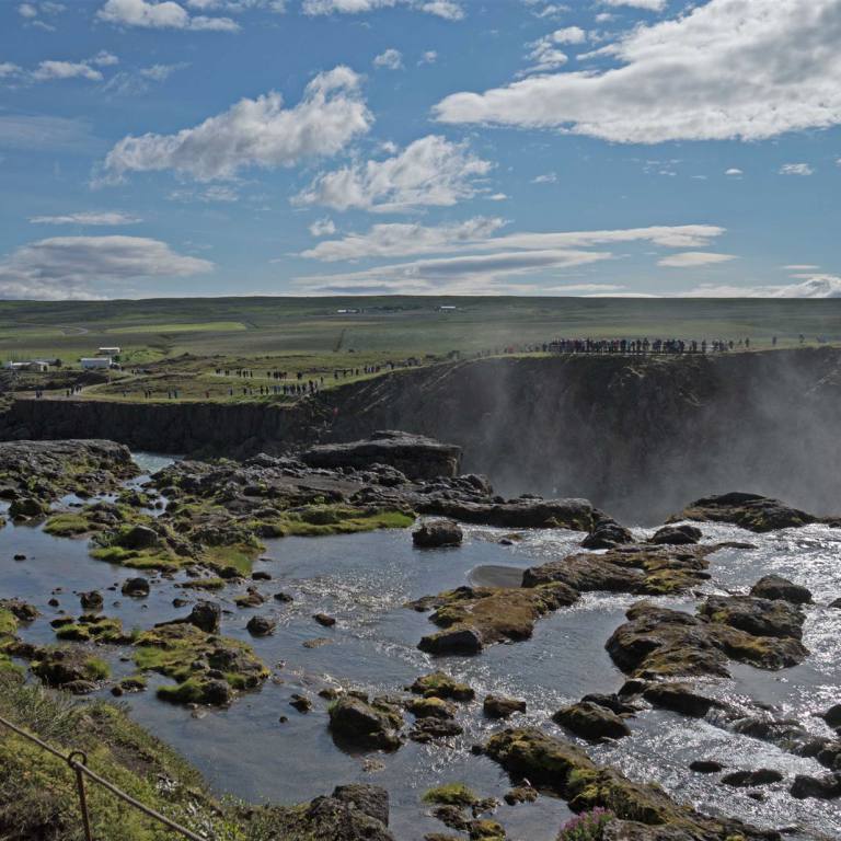 Zuerst besuchten wir einen Wasserfall. Wir waren nicht alleine. Schon von weitem sahen wir die Touribusse. Es hat einen grossen Parkplatz. Von dort aus konnte man entweder links oder rechts des Flusses hochmarschieren. Wir wählten die rechte Seite und waren damit richtig. Die Aussicht auf den Wasserfall (Godafoss) ist beeindruckend.