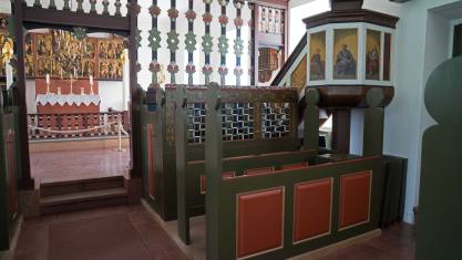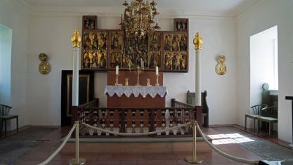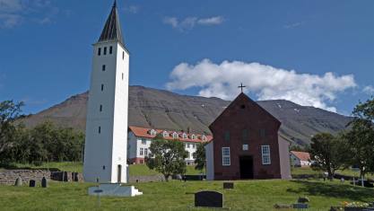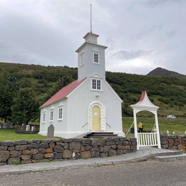 Das war ein kurzer Besuch. Unterwegs machten wir noch einen kleinen Abstecher. Uns wurde ein Dom versprochen. Am Ort stand aber eine kleine Kirche. Über 700 Jahre lang war Hólar das religiöse und kulturelle Zentrum von Nordisland. Nachdem Hólar im Jahr 1106 neben Skálholt zum zweiten Bischofsitz Islands wurde, gelangte das Bistum in den folgenden Jahrhunderten zu beachtlichem Reichtum und konnte schließlich ein Viertel des Landes zu seinem Grundbesitz zählen. Die Kirche aus dem Jahr 1763 ist die fünfte an diesem Platz und gleichzeitig die kleinste. Die Kirche wurde mit einem Glockenturm geplant aber dieser wurde nie gebaut. Der Turm der Kirche stammt aus dem Jahr 1950 und wurde zum Gedenken an den letzten katholischen Bischof von Hólar gebaut.