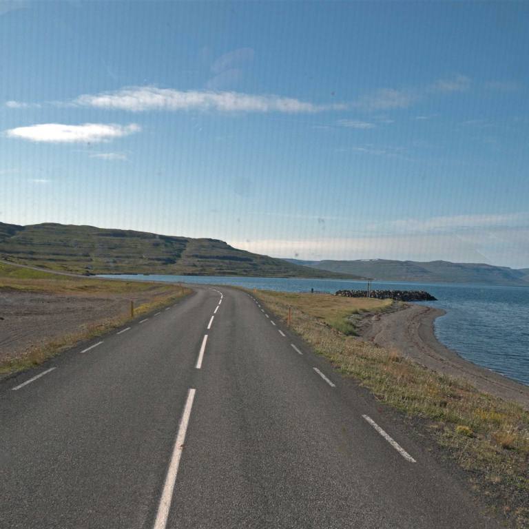 Beim Aufstehen strahlte die Sonne uns ins Gesicht. Ein wunderschöner Tag mit einer traumhaften Kulisse begleitete uns auf unserem Weg. Es ging durch drei Tunnels. Der erste Tunnel einspurig mit vielen Ausweichbuchten.3 km lang. Wir trafen im Tunnel kein Fahrzeug. Bei der Ausfahrt sah ich, dass der Gegenverkehr angehalten wurde wegen mir. Kurz nachher ein 8 km langer ab zweispuriger Tunnel. Die Strecke schnurgerade ohne Biegungen. Hier war das Kreuzen kein Problem. Wir erreichten Siglufjödur ein kleiner Fischerort. In der Zeit des Heringsbooms hatte Siglufjörður über 3.000 Einwohner. Von der Glanzzeit zeugt noch das Heringsfangmuseum und ein Heringsfest.