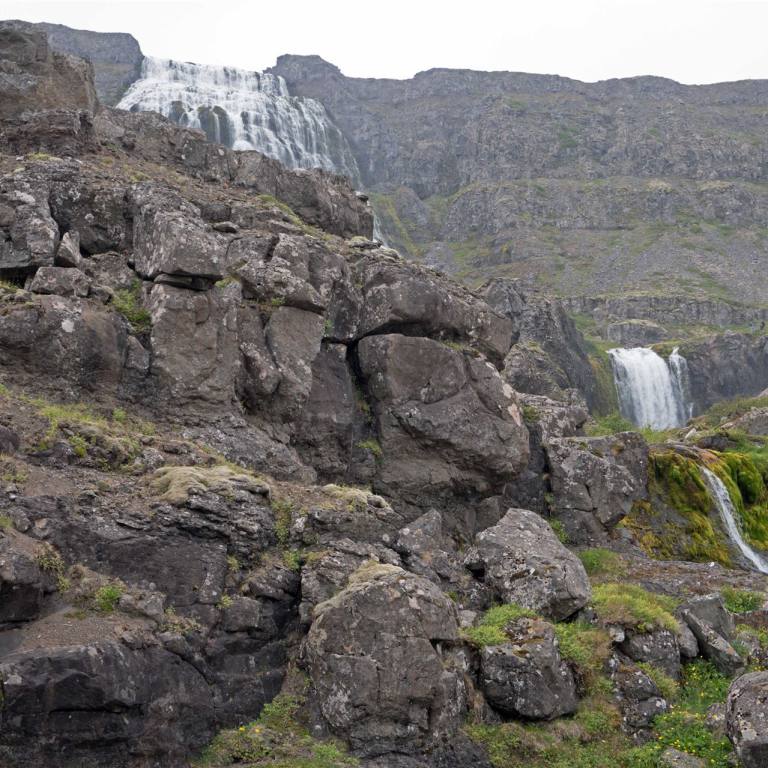 Nach dem gestrigen schönen Tag war es heute hochnebelartig bewölkt. Der heutige Tag hatte es ins sich. Wir starteten um 09.00 Uhr zu unserer Tour. Der erste Punkt war der Dynjandi Wasserfall. Es ist einer der Höhepunkte der Westfjorde. Die zahlreichen Wasserfälle an diesem Ort bilden ein einmaliges Szenario. Dieser Wasserfall ist einer der imposantesten Islands und zweifellos der schönste auf den Westfjorden. Die Wasser der Dynjandisá scheinen wie in Zeitlupe als breiter und zugleich filigraner Vorhang zu Tal zu schweben. Der Fall hat eine Höhe von 100 m. Die Breite oben ist 30 m und unten 60 m.