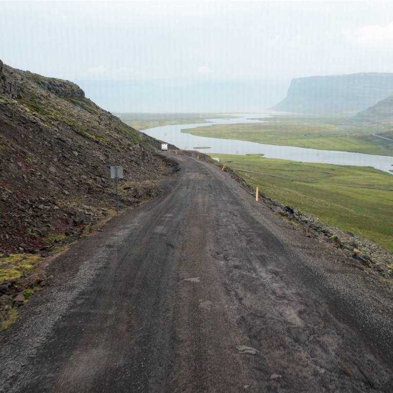 In der Nacht hat es ein wenig geregnet. Bei der Abfahrt war es aber wieder trocken. Die Strassen waren aber Nass und die Löcher mit Wasser gefüllt. Zuerst mussten wir die Naturstrasse wieder zurück fahren. Dann hatten wir aber wieder Asphalt. Unterwegs gab es keine Sehenswürdigkeiten. Der Weg war eigentlich die Sehenswürdigkeit. Bedingt durch den Regen und den Dunst sah man die ganze Schönheit aber nicht. Wir haben vom ausgebrochenen Vulkan anscheinend die Aschenwolken, was das Wetter so gestaltet. Normalerweise hätten wir schönes Wetter. Das soll sich aber Morgen wieder ändern. Der Wind dreht. In der zweiten Streckenhälfte kamen wir nochmals in den Genuss von Schotterstrassen. Mehr als 30 km pro Stunde war nicht drin. Es klapperte und schepperte im Wohnmobil. Die Landschaft war aber trotzdem sehr schön.
