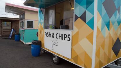 Wir fuhren weiter zu unserem Campingplatz. Er liegt mitten im Dorf. Mit dem Fahrzeug fuhren wir zum Hafen wor ein Hurtigruten Schiff am auslaufen war. Es war die Flam, die als Explorer Schiff Grönland, Spitzbergen und andere nordische Länder anläuft. Ein weiteres futuristisches Schiff macht individuelle Kreuzfahrten mit 280 Passagieren. Der Grund aber unseres Besuches war der Fisch und Chips Stand. Wir wollten fangfrischen Fisch, den wir auch in bester Qualität bekamen.
