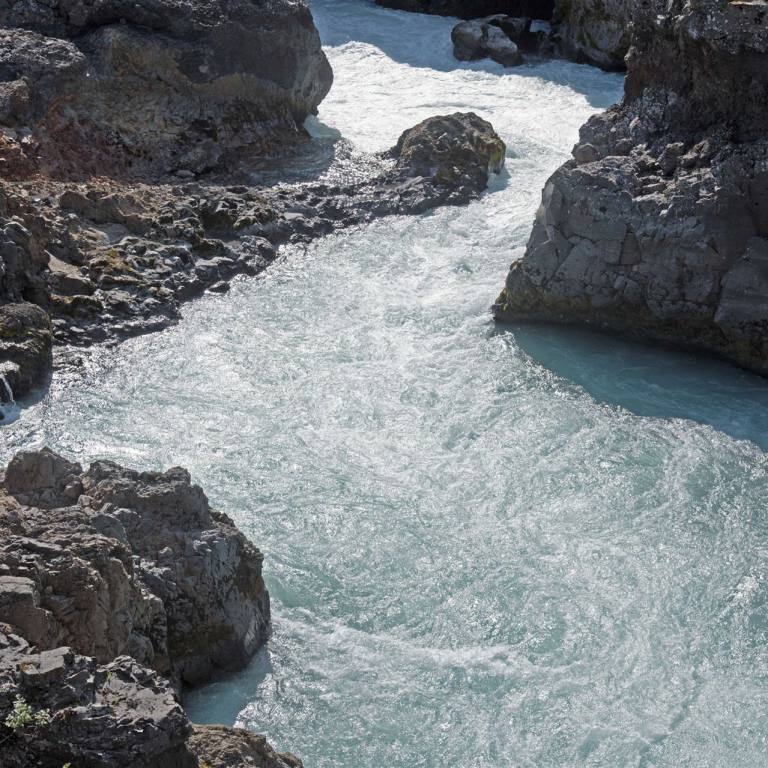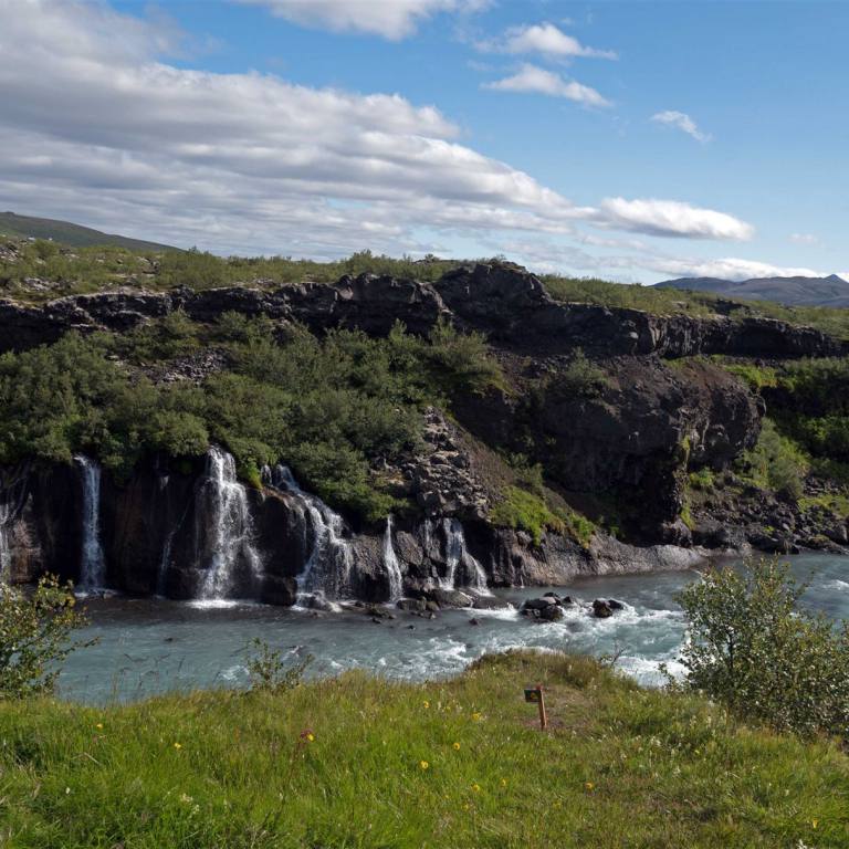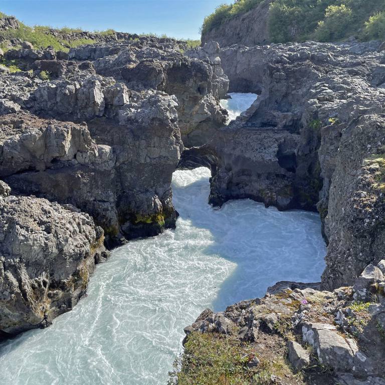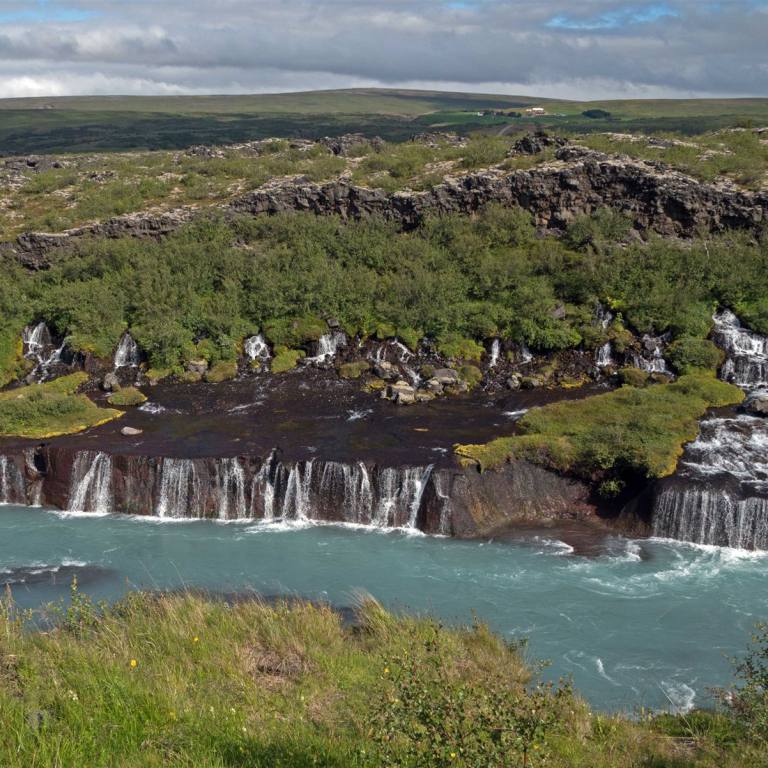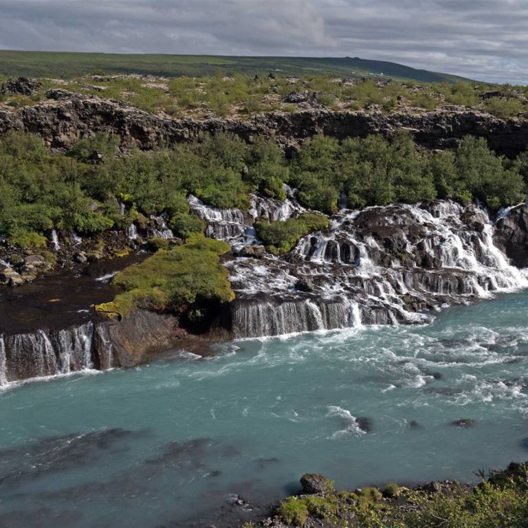 Ein wunderschöner Morgen überraschte uns heute. Es war wolkenlos, sonnig und an der Sonne schon angenehm warm. Wie bereits angekündigt fuhren wir eine kurze Strecke wieder zurück. Als erstes gab es zwei weitere Wasserfälle zu bestaunen. Sie liegen hintereinander. Wieder erwartete uns ein völliger neuer Anblick des Wasserfalles. Dieser kam nicht wie bisher von den Bergen, sondern es war ein Fluss der eine Höhendifferenz überwinden musste. Die Wasserfälle Hraunfossar und Barnafoss fallen das Lavafeld von Hallmundarhraun herunter und münden in den Hvítá-Fluss Sie werden oft als einige der schönsten Wasserfälle Islands gelistet. Das unfassbar blaue Wasser kommt direkt aus dem Langjökull Gletscher, dem zweit größten Gletscher Islands.