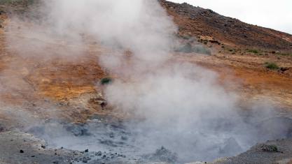 Wenn man den kleinen Pass auf der anderen Seite runterfährt sieht man von weitem schon die die Vulkanlandschaft von Hverir mit unglaublichen Landschaften mit dampfender Erdoberfläche, ocker- farbene Hügel und brodelnde Schlammtöpfe. Die weite sandartige Ebene, die ockerfarbene Umgebung, die dampfende Schlammtöpfe, der beissende schwefelartige Geruch, die feinen Nebelschwaden über der Erdoberfläche, schon auf der Fahrt über den Námaskarð Pass auf der Ringstrasse nach Hverir zeigt sich die vulkanische Aktivität der Region auf eine vielseitige Art und Weise. Es hat einen grossen Parkplatz der bewirtschaftet ist. Zu Fuss läuft man dann in wenigen Schritten zu den qualmenden Stellen wo der schwefelhaltige Dampf ausgestossen wird. Es ist schon eindrücklich die Landschaft durchlaufen zu können und mitten im vulkanischen Gebiet live die Eindrücke mit nehmen zu können.