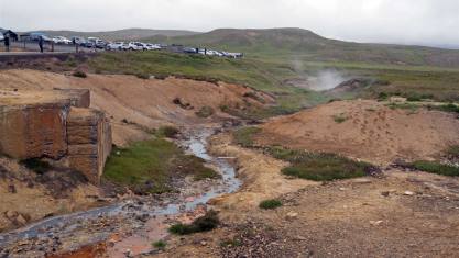 Das Wetter war heute den ganzen Tag bedeckt (Hochnebel). Wir fuhren um halb zehn los. Wir hatten keine grosse Strecke zu bewältigen und auch nicht viel zu besuchen. Unser erster Halt galt dem Thermalgebiet von Seltun. Das Geothermalgebiet mit seinen großen, blubbernden Schlammtöpfen und den farbigen Ablagerungen auf der rotbraunen Erde ist eine Augenweide. Für den Holzstegweg wird man je nach Interesse an den Informationstafeln und Fotopausen zwischen 20 und 30 Minuten benötigen. Will man allerdings den spektakulären Ausblick genießen, sollte man ca. 40 Minuten mehr, gute Schuhe und ein wenig Kondition mitbringen. Am oberen Ende des befestigten Weges führt links ein schmaler Pfad den Hügel hinauf. Meistens sieht man ein paar Leute laufen und bekommt eine Ahnung davon, wie man sich sicher durch das Thermalgebiet Richtung Aussicht zu bewegen hat. Oben angekommen, kann man sich an der Landschaft gar nicht sattsehen. Hinter dem Geothermalgebiet liegt einer der tiefsten Seen Islands, der Kleifarvatn. Bekannt wurde er 2000, als er nach einem starken Erdbeben ein Fünftel seiner Wassermenge 'verlor'. Wir beliessen es unten zu bleiben. Auch hier blubbert es aus allen Löchern. Der Schwefelgestank zeigt uns dass da unten in der Erde etwas los ist.