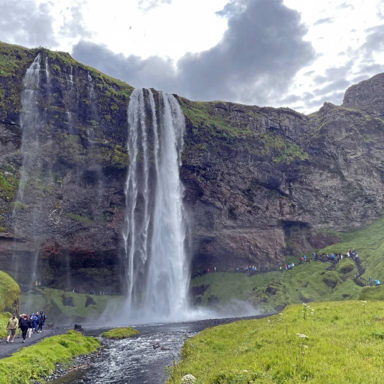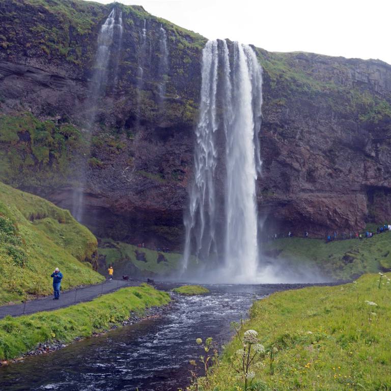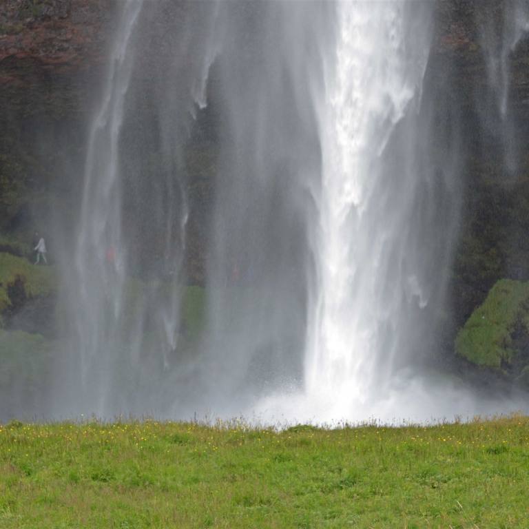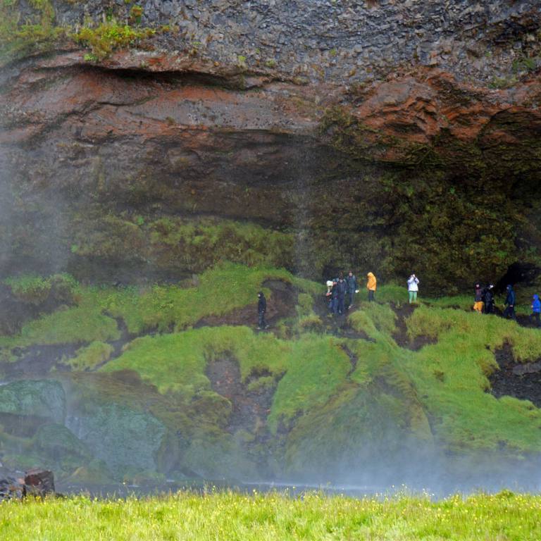 Nach der interessanten Lehrstunde fuhren wir weiter. Auch heute haben wir wenige Kilometer zu fahren. Es ist wieder ein Wasserfall auf der Strecke zum besuchen (ein muss). Der Seljalandsfoss ist ein vollständig umrundbarer Wasserfall an der Südküste Islands mit einem Gefälle von 60 Metern. Der Wasserfall ist Teil des Flusses Seljalandsá, entspringt unterhalb des Gletschers Eyjafjallajökull. Der Vulkan unter dieser Eiskappe war derjenige, der 2010 ausbrach und in Flughäfen in ganz Europa Chaos anrichtete. Die Kaskade des Wasserfalls ist relativ schmal, stürzt aber von einer hohen Klippe, die einst die Küstenlinie des Landes markierte.