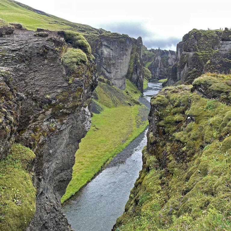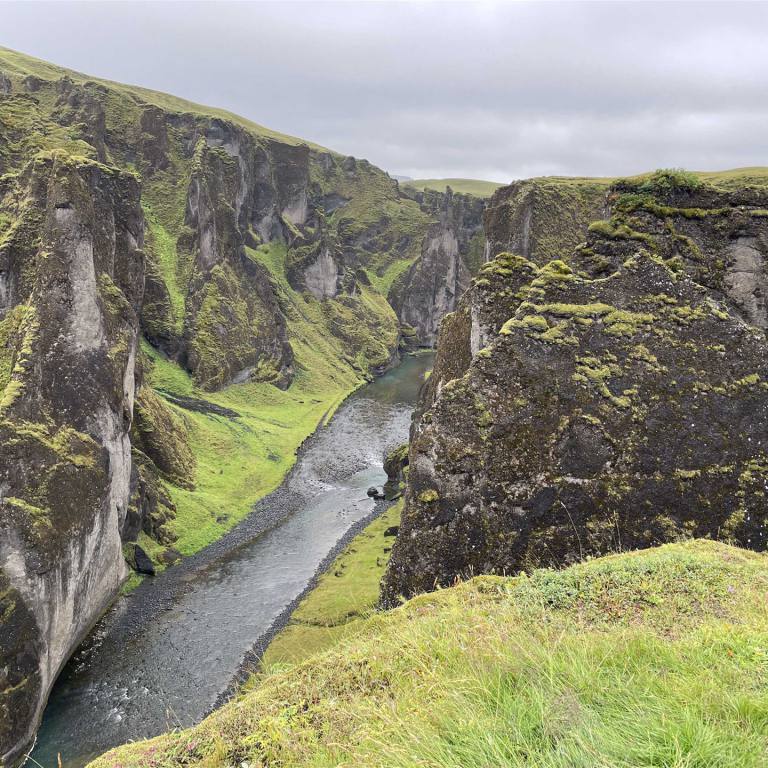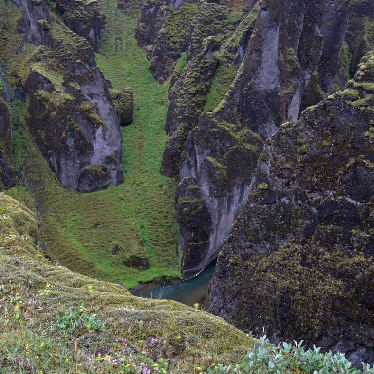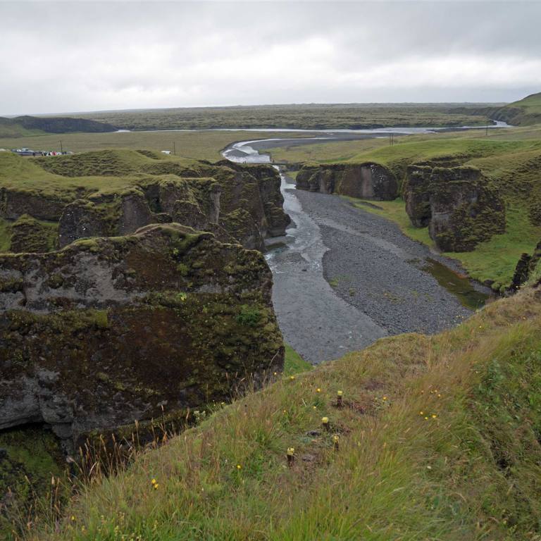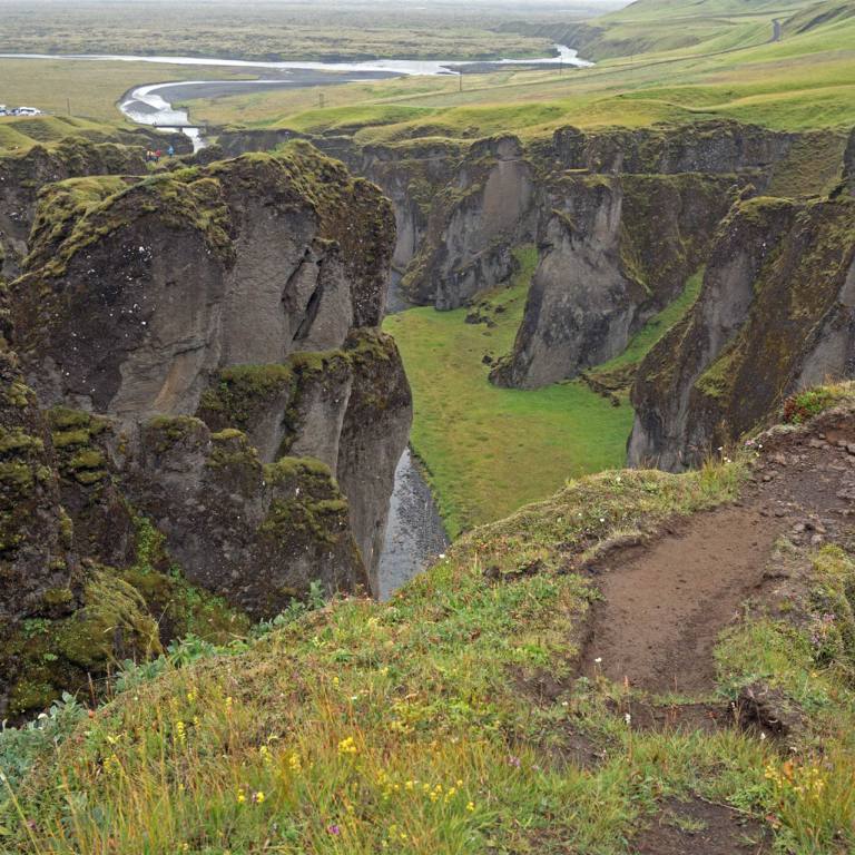 Je weiter wir östlich kamen desto stärker setzte der Regen ein. Ein weiterer Stopp bei einem Canyon war dann schon schöner anzusehen. (Fjadrargljufur) Bei unserer Ankunft sahen wir schon von weitem die vielen Autos. Da war was los. Eine ganze Völkerwanderung pilgerte Bergaufwärts zum Canyon. Die Schlucht ist an einigen Stellen bis zu 100 Meter tief und hat eine Länge von etwa zwei Kilometern. Entstanden ist die Schlucht durch die Kraft des fließenden Wassers, das sich von den Gletschern kommend einen Weg durch das Palagonitgestein bahnte und im Laufe der Jahrtausende immer tiefer hineingrub. Die Schlucht steht unter Naturschutz.