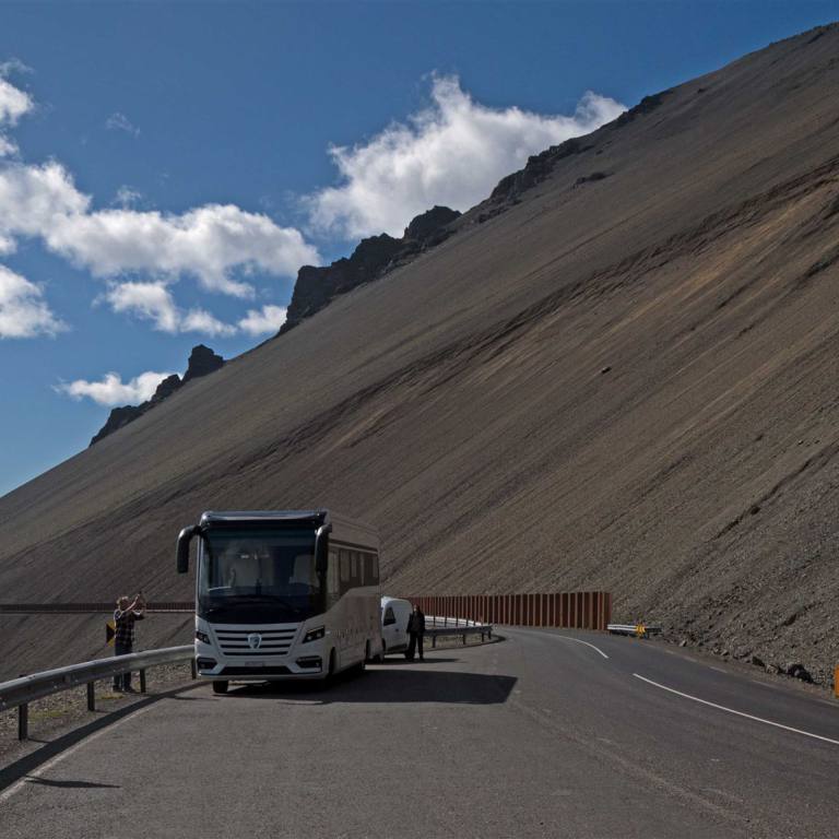 Heute hatte das Wohnmobil Ruhetag. Wir machten einen Ausflug in die Berge. Landmannalaugar ist eine geothermische Oase, die sich inmitten der abgelegenen Tundra im Herzen Islands findet, im Hochland Islands. Es befindet sich im südlichen Hochland inmitten des Fjallabak-Naturreservats, dessen Name so viel wie "Bergrücken" bedeutet. Wir wurden auf dem Campingplatz von einem Vierradangetriebenen Bus abgeholt. Nun stand uns eine strapaziöse Fahrt bevor. Die erste Stunde war noch easy. Dann ging es aber ins Gebirge. Wir konnten den Bus gut gebrauchen. Der Chauffeur zeigte seine ganze Kunst des Fahrens. Die Strasse nun nur noch Schotter und schmal. Es ging mehrheitlich nur noch bergauf. Es schüttelte, knisterte in allen Ecken und wir wurden gehörig durchgeschüttelt. Der Chauffeur interessierte das nicht. Er quälte den relativ neuen Bus durch die engen Wege und schob PW's vor sich her, bis sie Angst hatten und stehen blieben. Dann konnte er wieder wirken. Weiter ging es im horrenden Tempo. Wir waren glücklich als wir oben ankamen.