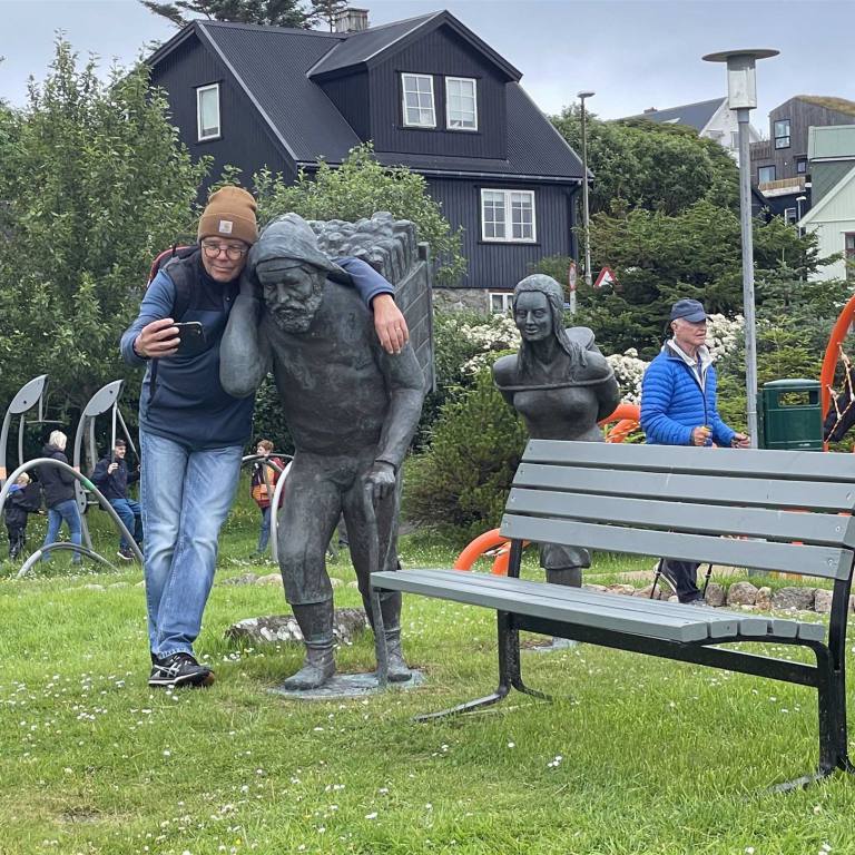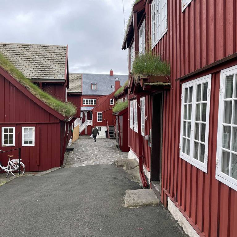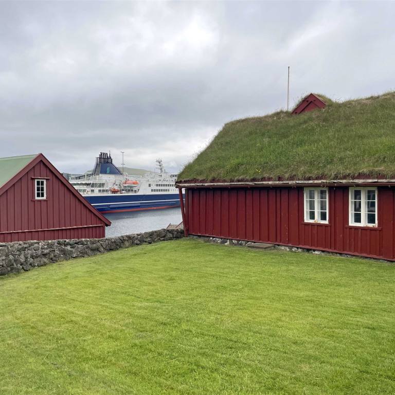 Rechtzeitig machten wir uns auf den Weg zum Hafen. Unsere Fähre fuhr um 17.30 Uhr. Wir reihten uns in die Schlange der Wohnmobile ein und unternahmen nachher alle miteinander noch eine kleine Stadtführung mit unserem Führer Lukas. Tórshavn ist die Hauptstadt der Färöer und liegt auf der Insel Streymoy. Sie ist für die auf der Halbinsel Tinganes gelegene Altstadt mit den aneinandergedrängten Holzhäusern mit Torfdächern bekannt. In der Nähe befindet sich die Domkirche zu Tórshavn, die im 19. Jahrhundert wieder aufgebaut wurde. Die Fußgängerzone Niels Finsensgøta wird von kleinen Läden gesäumt. Wir waren gute 1.5 h unterwegs. Dann wurde es Zeit einzuchecken. Die Fähre kam pünktlich. Schnell waren alle Fahrzeuge geladen. Wie immer auf den letzten Meter. Hans und ich gingen in die Cafeteria um etwas zu Essen. Anschliessend gingen wir in die Kombüse. Es dauerte nicht lange bis wir auf dem Meer waren und es begann zu schaukeln. Das schlechte Wetter und der starke Wind brachten ziemlich Wellen, die uns etwas den Schlaf raubten. Zum Glück wurden wir nicht Seekrank wie andere Teilnehmer.