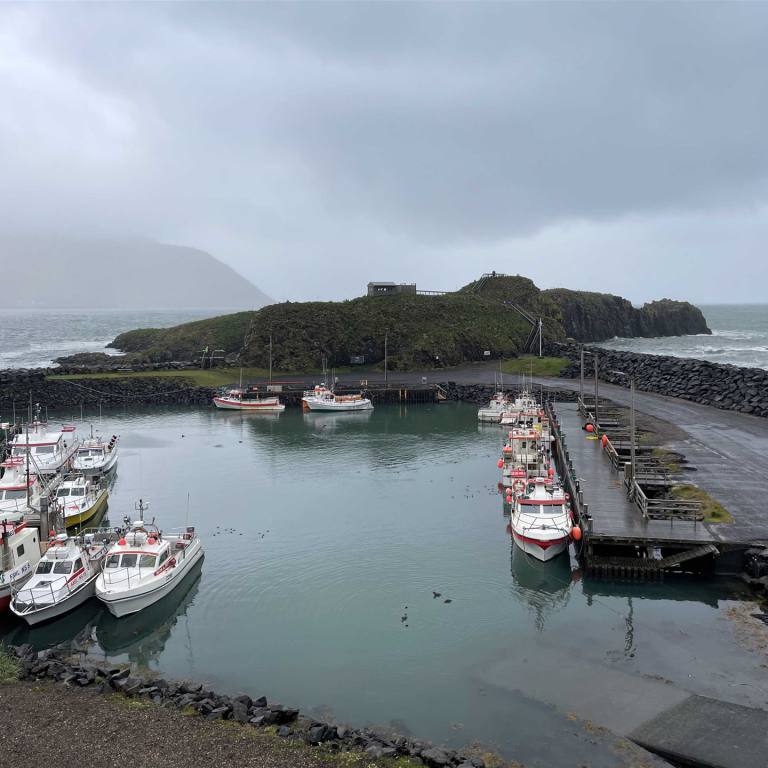 Unser Endpunkt für heute war Höfn. Ein wunderschöner Stellplatz mitten im Dorf. Höfn ist ein lebhaftes Fischerdorf an der Südostküste Islands. Benannt nach dem isländischen Wort für ‚Hafen‘, ist dieser Ort ein beliebter Ausgangspunkt für Touren zum nahegelegenen Hornafjörður-Fjord sowie zum Vatnajökull, dem größten Gletscher Europas. Auch die Gletscherlagune Jökulsárlón, der Diamantstrand und der Berg Vestrahorn sind von Höfn aus gut erreichbar. Das Städtchen selbst hat viel zu bieten, von Naturkundemuseen und Kunstgalerien mit lokalem Kunsthandwerk bis hin zu historischen Gebäuden wie dem Gamlabúð. Ein erhaltenes Filmset zeugt vom Leben in längst vergangenen Zeiten. Alljährlich findet ein Hummerfestival statt. Wir haben ein Restaurant aufgesucht um Fisch zu Essen. Es gab mehr Hummer auf der Speisekarte als Fisch. Wir fanden aber ein Fischauflaufgericht das mundete. Bei unserem kleinen Spaziergang sahen wir dann doch schöne Fische die aus einem kleinen Boot entladen wurden. Es waren prächtige Kabeljau die in Kisten verfrachtet wurden.