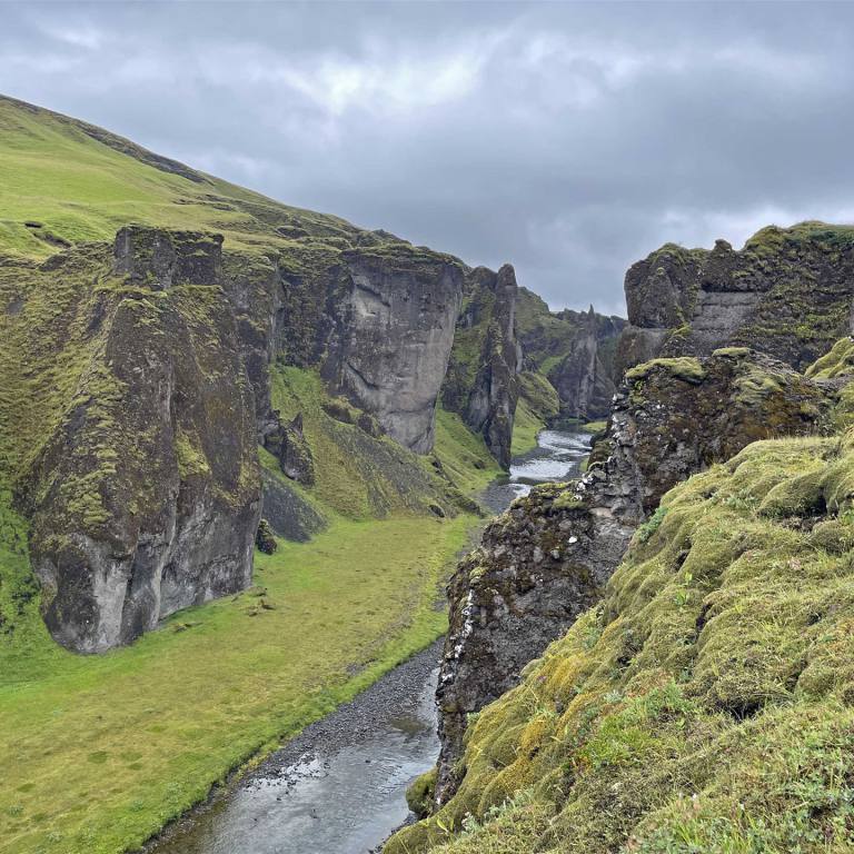 Wir hatten das Glück, dass es am Anfang nicht regnete. Als ich oben war begann es zuerst leicht dann immer stärker. Die Aussicht auf den Canyon war imposant. Der Fluss ist nicht sehr gross aber seine Umgebung traumhaft. Es hatte viele Besucher, die verlaufen sich aber entlang des Canyons. Ich schaffte es mit meinem Knie fast bis nach oben. Es hatte sich gelohnt. Nun hatten wir keinen weiteren Halt vorgesehen. Es regnete in Strömen. Ich war froh, so wurde mein Fahrzeug wieder einmal vom Staub befreit. Die Landschaft seit wir von Vik abgefahren waren, war sehr abwechslungsreich. Zuerst wurde es flach. Später kamen die mit Moos bewachsenen Steine und dann wieder auf der linken Seite hohes Gebirge. Je näher wir an unseren Zielort kamen desto mehr sahen wir den riesigen Gletscher, seine Ausläufer reichten beinahe bis ins Flachland.