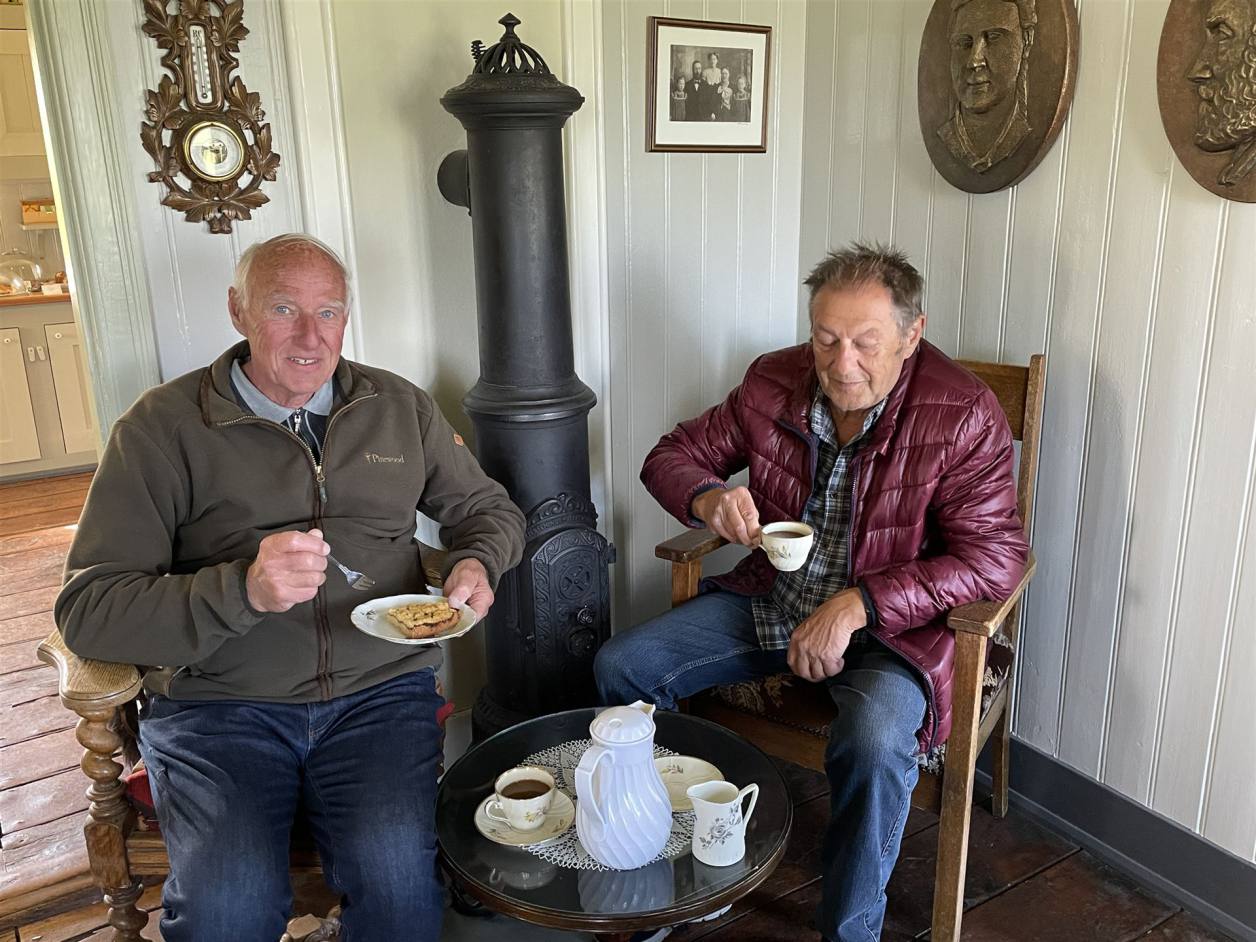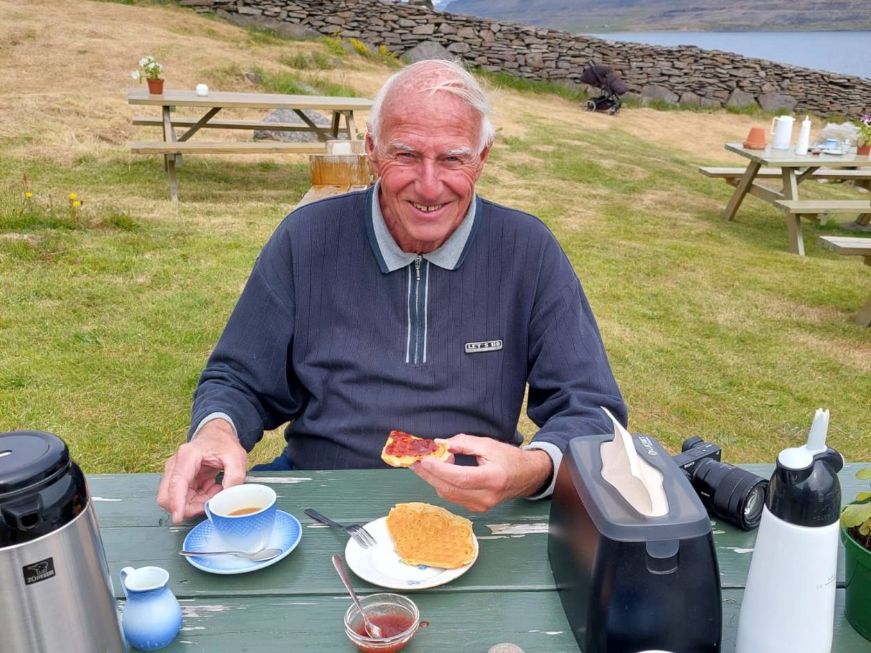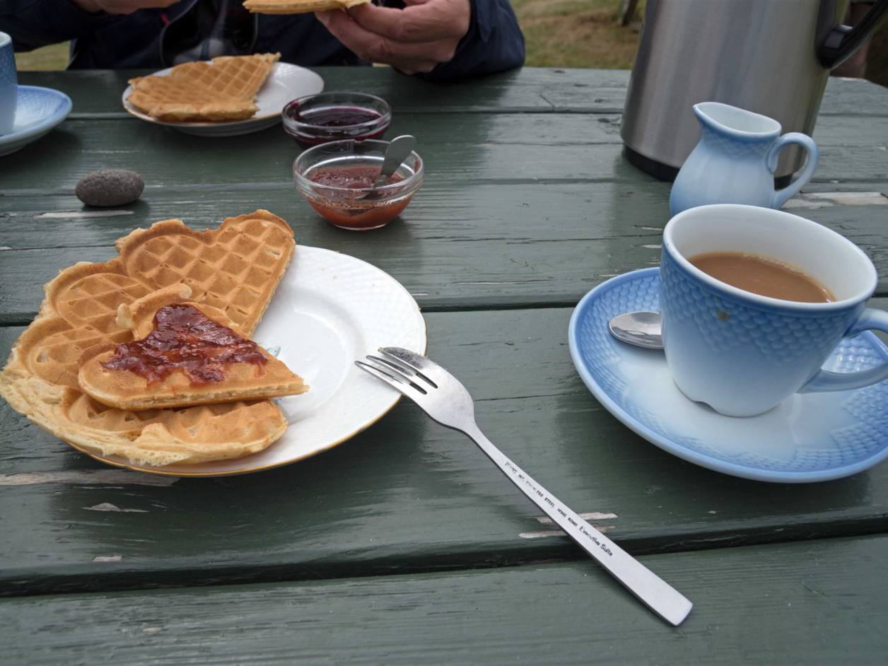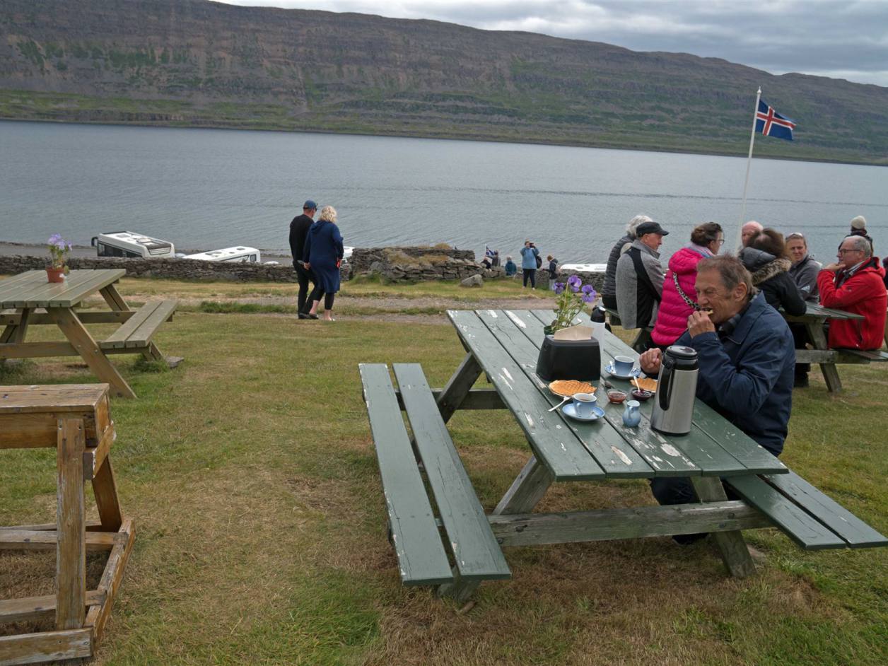 Wir fuhren weiter zum nächsten Stopp an einem Kaffee. Etwas erhöht lag das schöne alte Haus wo man Kaffee und Waffel bekommen konnte. Die Aussicht auf den Fjord und die Wale, die ich nur kurz sah. Für ein Foto reichte es nicht.