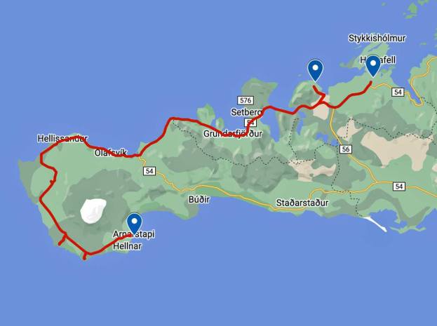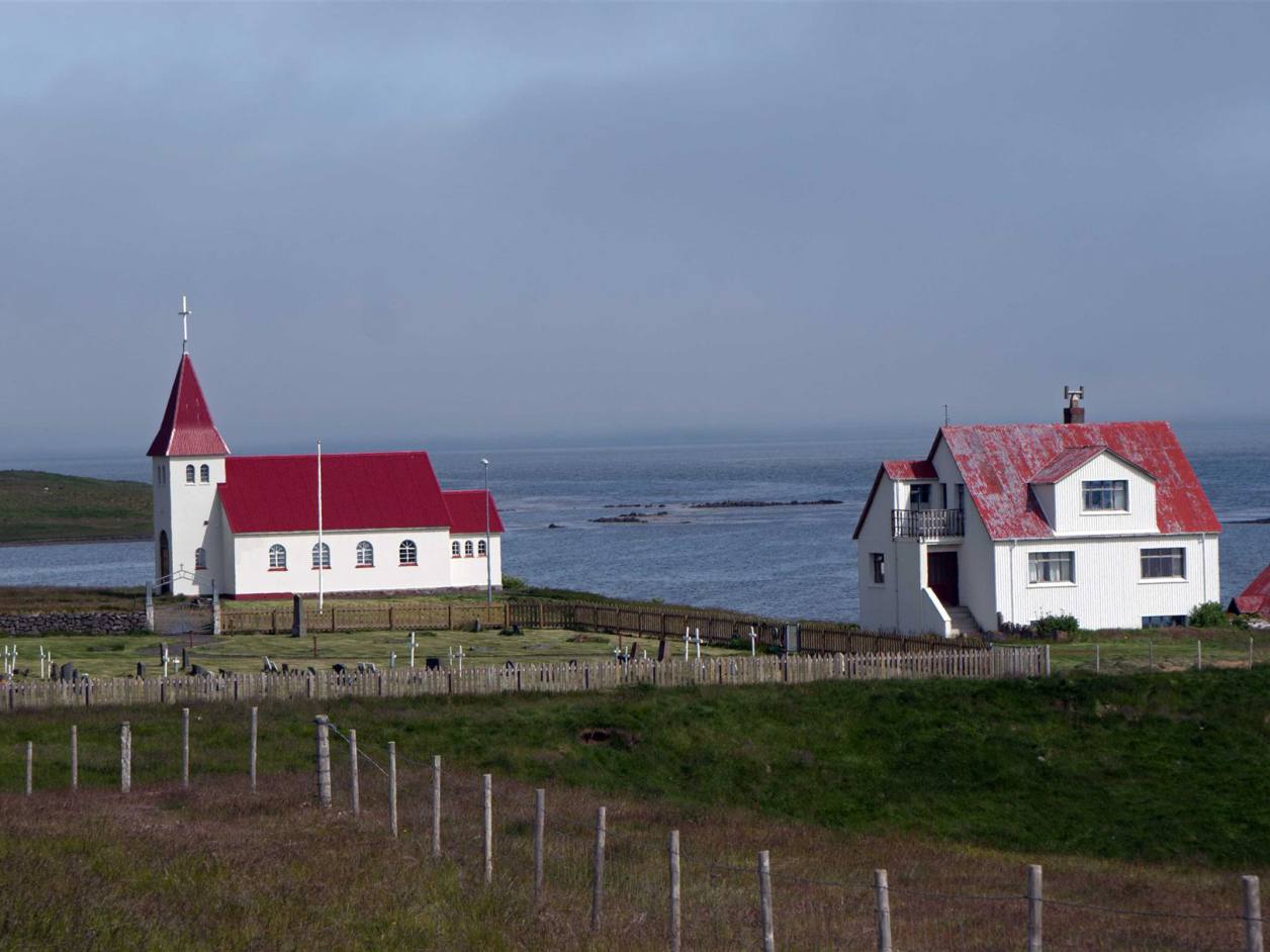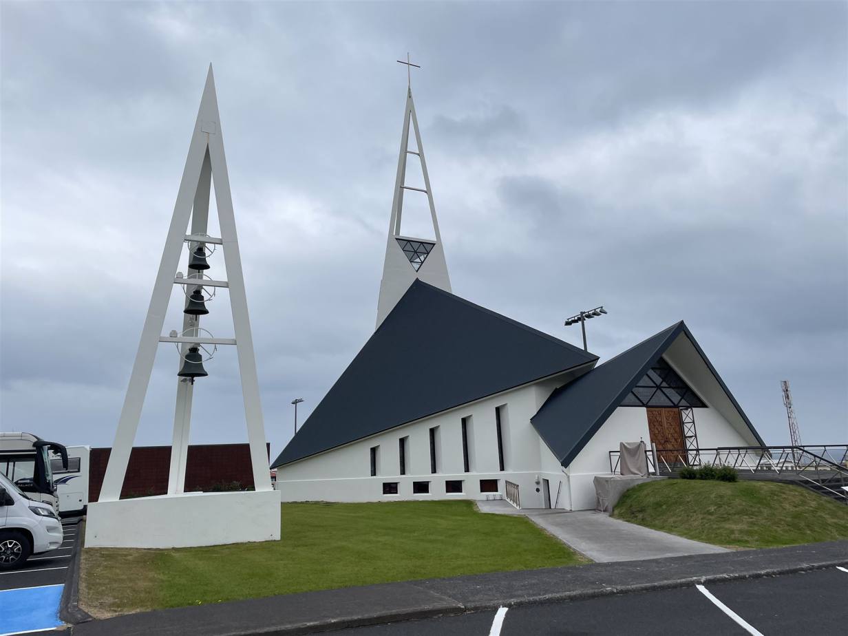 Wir machten einen weiteren Stopp im kleinen Hafenstädtchen Olafsvik. Nach einem kleinen Spaziergang im Hafen besuchten wir noch die eigenwillige Kirche oberhalb des Städtchens. Die Kirche in Ólafsvík ist das Wahrzeichen der Stadt. Die Kirche wurde 1967 geweiht und ist das erste „moderne Kirchengebäude“ in Island. Das Design der Kirche sieht von außen wie ein Fischerboot aus. Wenn man die Kirche von oben betrachtet, sieht sie ähnlich aus wie gesalzener Kabeljau. Die Elemente der Kirche sind dreieckigen Formen die die Dreifaltigkeit im Christentum symbolisieren. Diese Kirche hebt sich wirklich von anderen Gebäuden in Island ab.