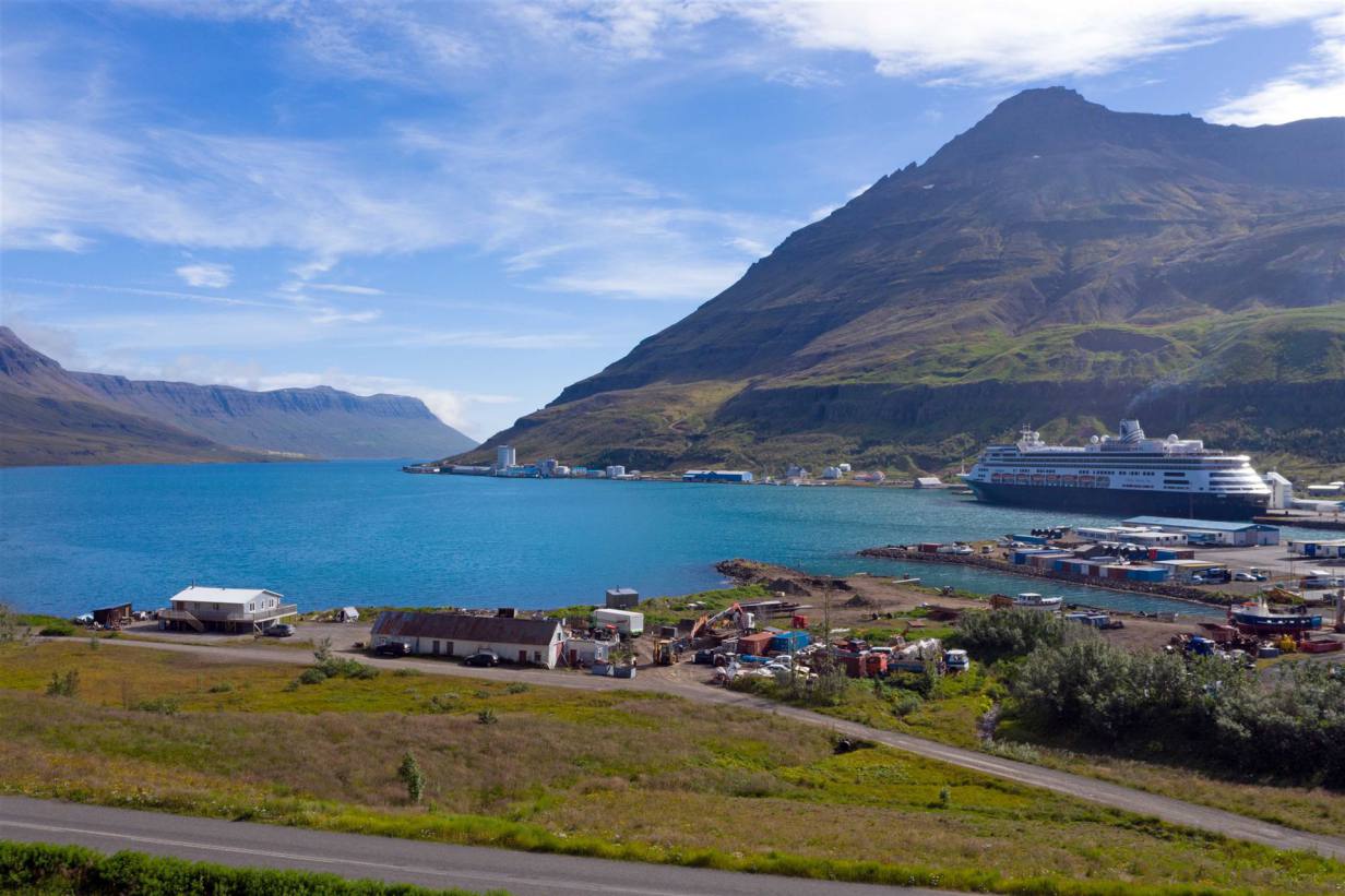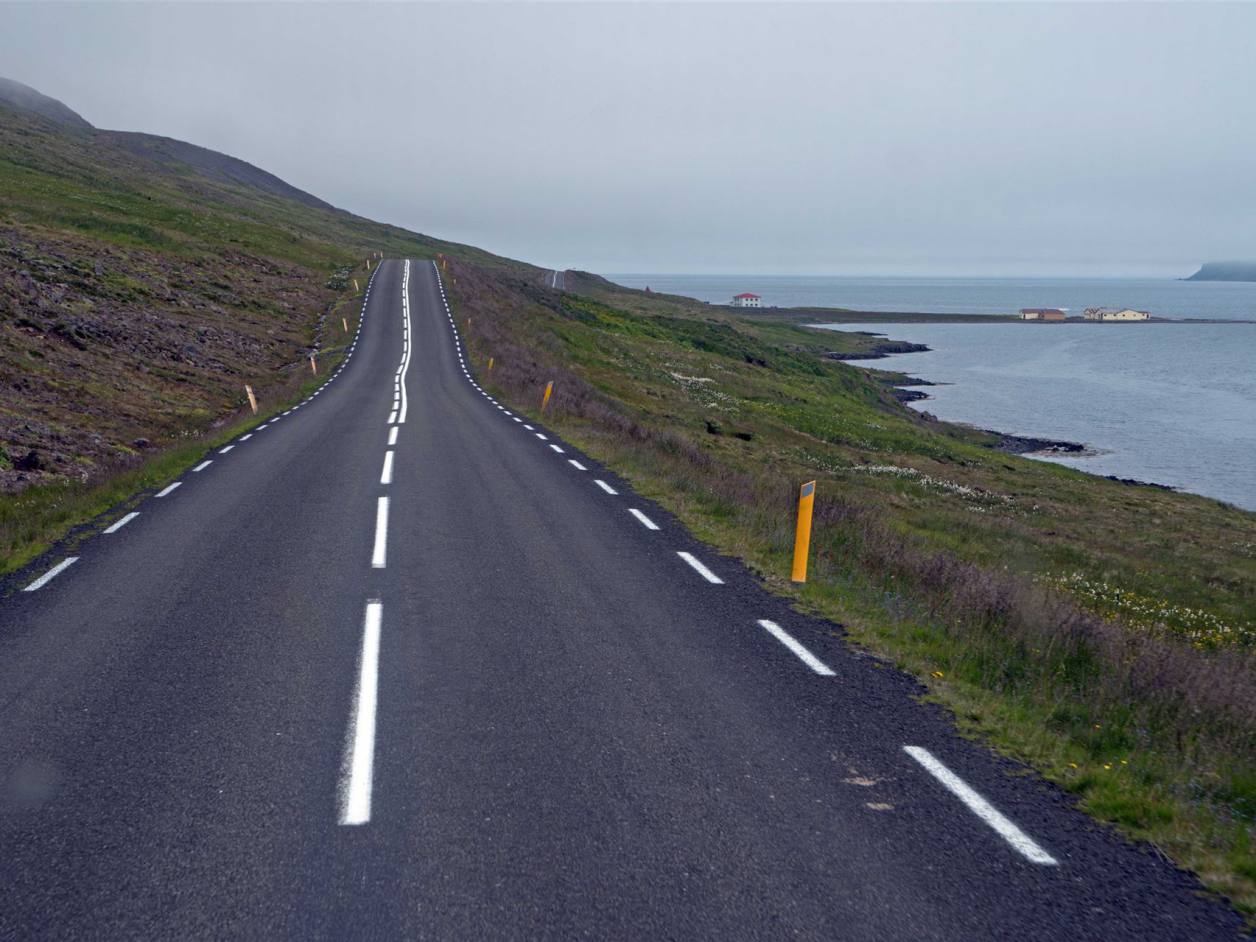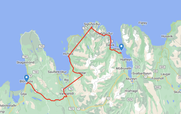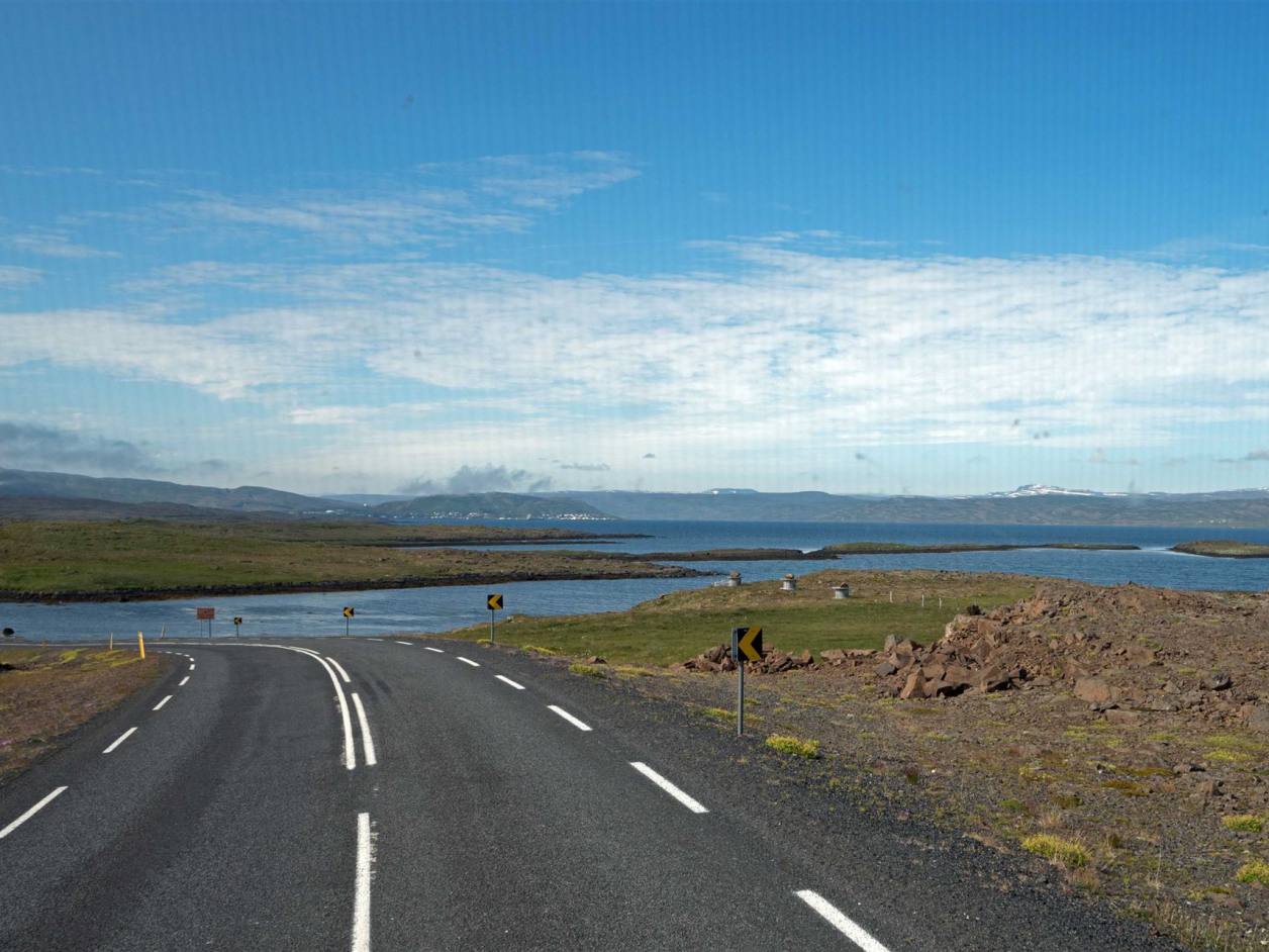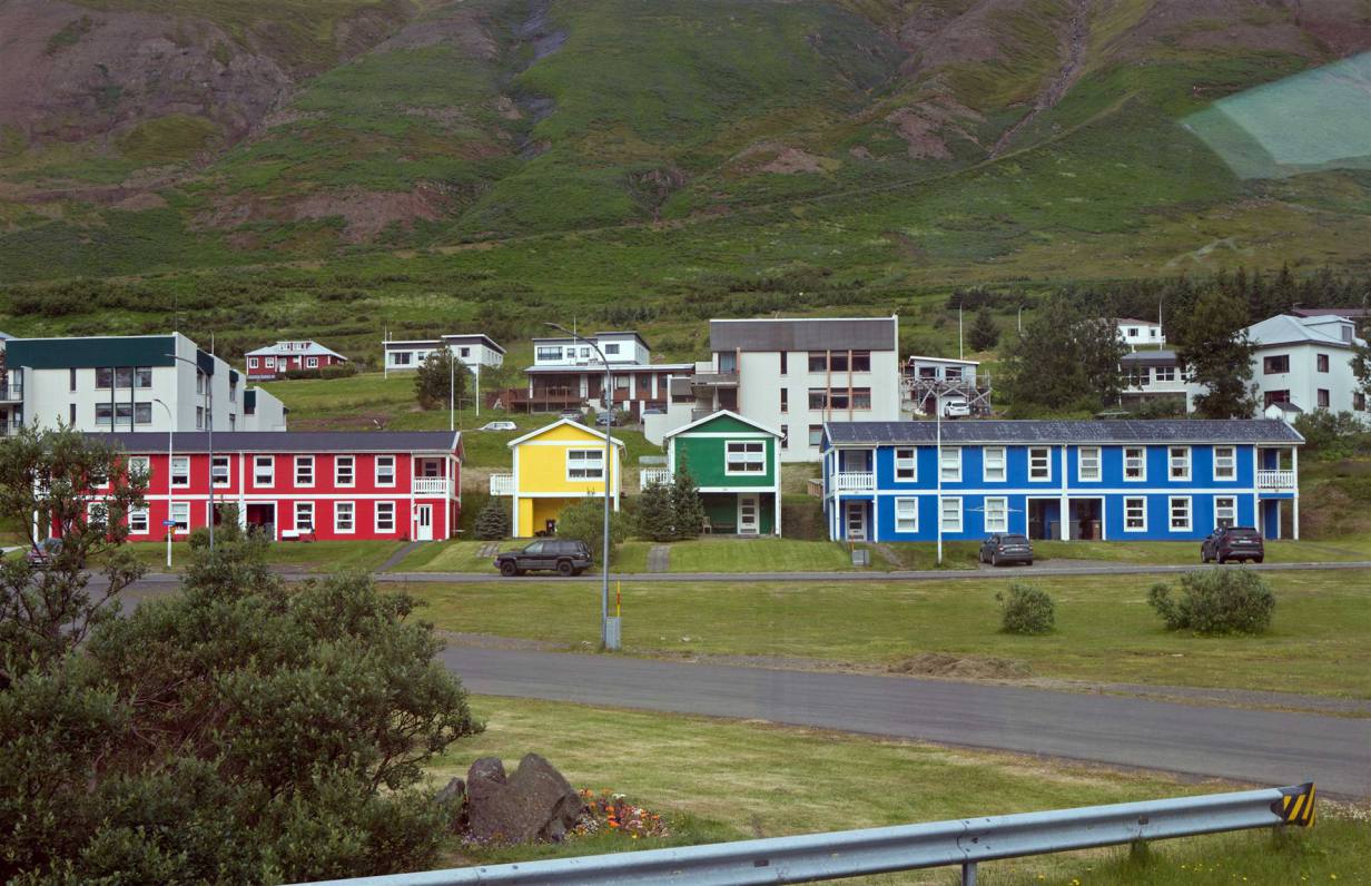 Beim Aufstehen strahlte die Sonne uns ins Gesicht. Ein wunderschöner Tag mit einer traumhaften Kulisse begleitete uns auf unserem Weg. Es ging durch drei Tunnels. Der erste Tunnel einspurig mit vielen Ausweichbuchten.3 km lang. Wir trafen im Tunnel kein Fahrzeug. Bei der Ausfahrt sah ich, dass der Gegenverkehr angehalten wurde wegen mir. Kurz nachher ein 8 km langer ab zweispuriger Tunnel. Die Strecke schnurgerade ohne Biegungen. Hier war das Kreuzen kein Problem. Wir erreichten Siglufjödur ein kleiner Fischerort. In der Zeit des Heringsbooms hatte Siglufjörður über 3.000 Einwohner. Von der Glanzzeit zeugt noch das Heringsfangmuseum und ein Heringsfest.