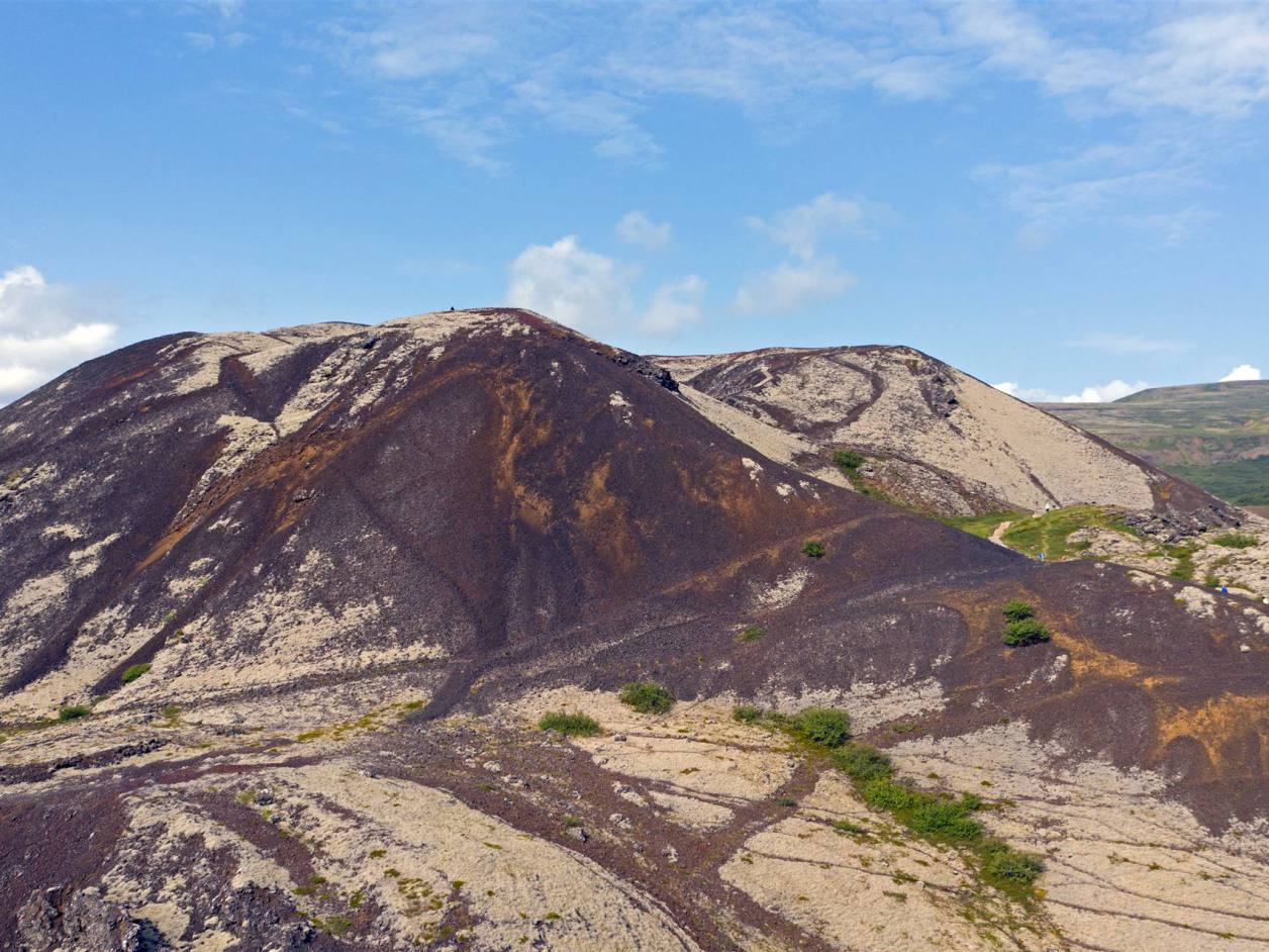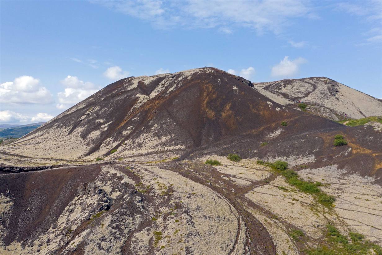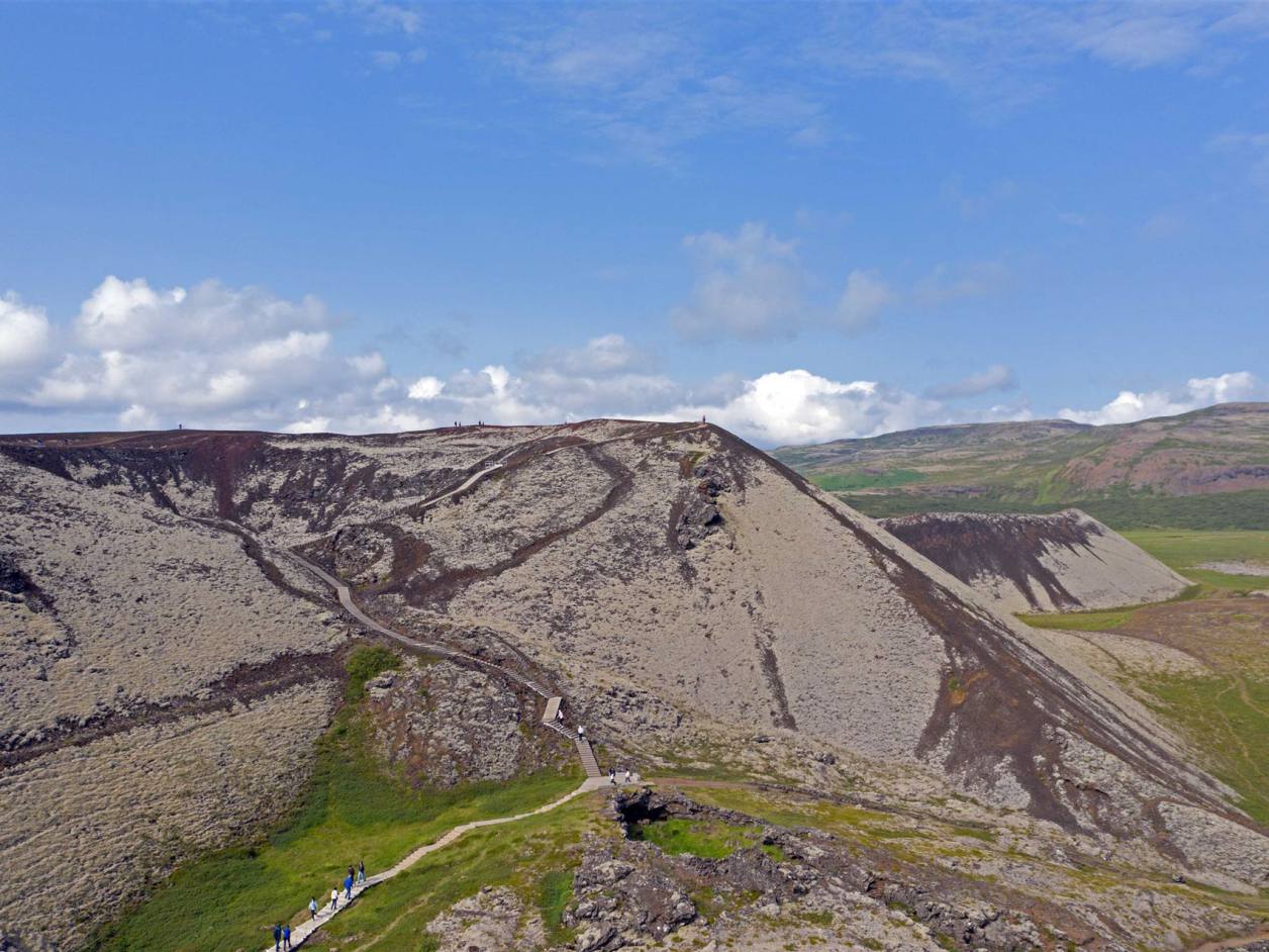 Der Krater ist bewachsen von farbenfrohem Moos und Flechten und auch wenn der Aufstieg etwas steil ist, lohnt sich der kurze Kraftakt auf jeden Fall. Von oben bietet sich ein super Blick über die anderen Krater, das "Universitätsgelände" und die restliche Busch- und Berglandschaft des Gebietes. In der Regel ist es hier recht ruhig und nur ein paar Reisende verirren sich entlang der Stufen. Der Pfad führt in 170 Meter Höhe einmal entlang des Kraters und ich kann diesen Rundgang nur empfehlen. Der isländische Wind kann einen hier zwar ganz schön durchpfeifen, die Szenerie lässt einen die Weite der Landschaft jedoch eindrucksvoll spüren und begeistert mich. Entstanden ist dieser sogenannte Schlackenvulkan vor etwa 3.600 Jahren und steht seit den 1960er Jahren unter Naturschutz.